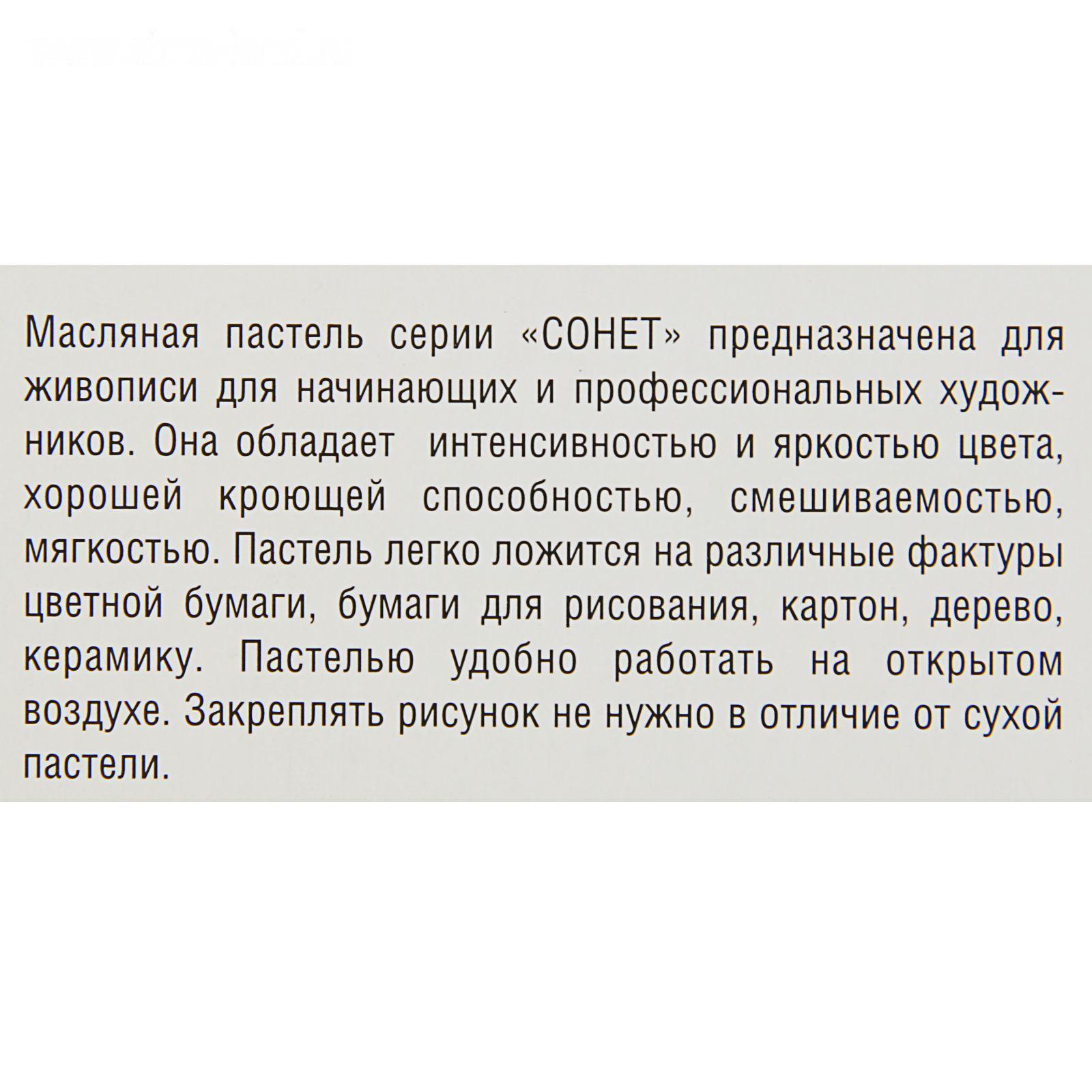 Масляная пастель "Сонет" изготовлена из высококачественных материалов. Она обладает интенсивностью и яркостью цвета, хорошей кроющей способностью, смешиваемостью, мягкостью. Пастель легко ложится на различные фактуры - цветную бумагу, бумагу для рисования, картон, дерево, керамику. Пастелью удобно работать на открытом воздухе. Дополнительное закрепление рисунка не требуется. Представлена в наборах по 12, 24 и 36 цветов. Состав набора: белая (2 шт.), желтая телесная, желто-розовая, лимонная, оранжево-желтая, оранжевая, розовая, алая, кармин, желто-зеленая, зеленая средняя, зеленая темная, травяная зеленая, небесно-голубая, синяя, берлинская лазурь, ультрамарин, фиолетовая cветлая, охра желтая, сиена натуральная, красно-коричневая, коричневая, серая, черная.