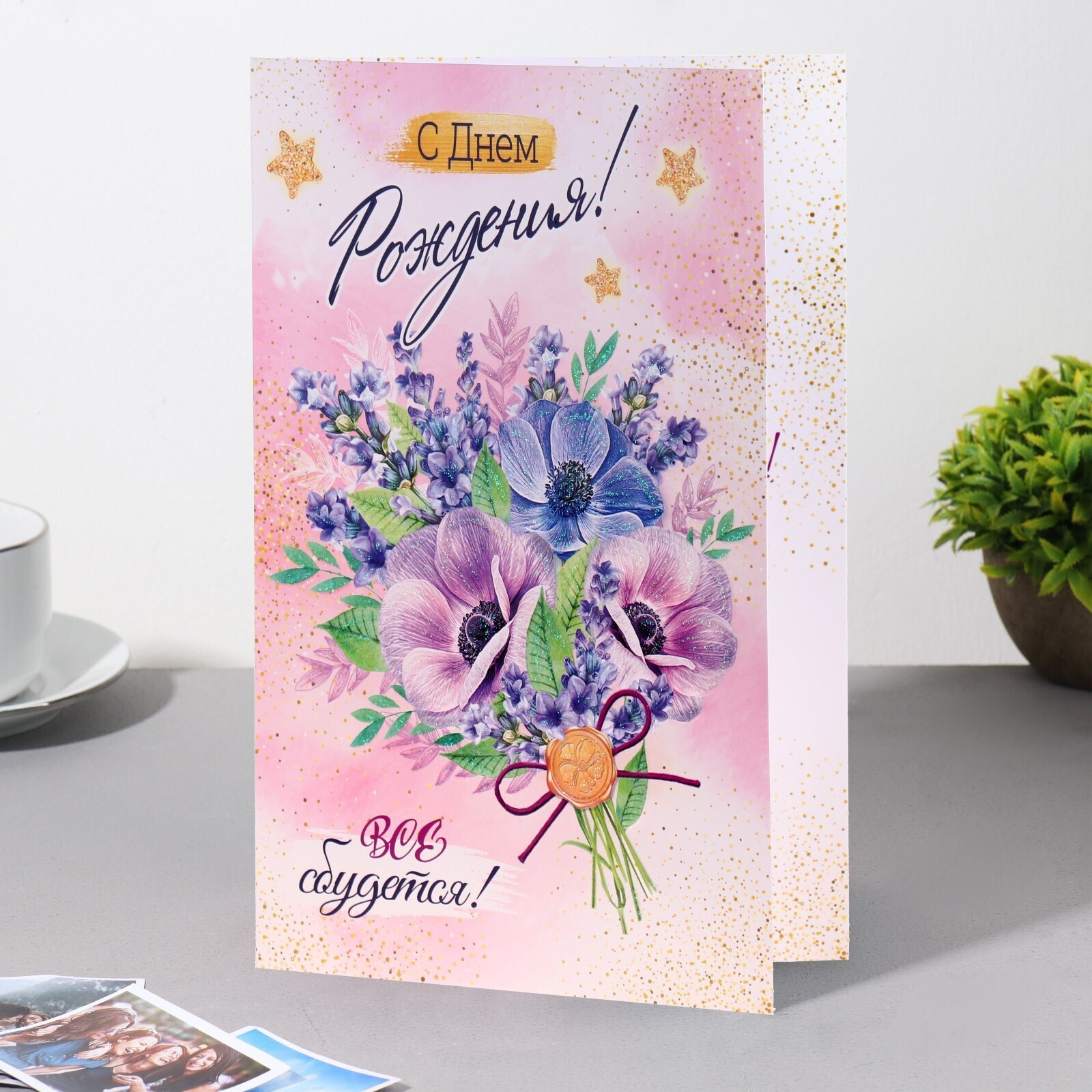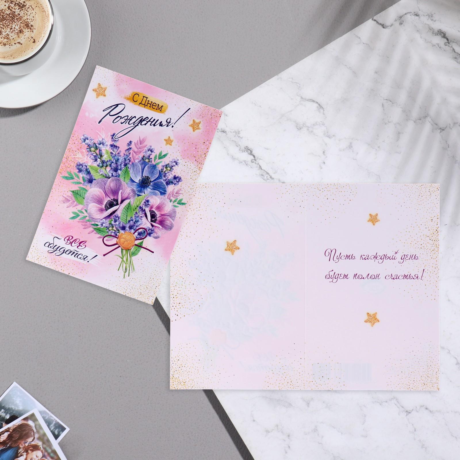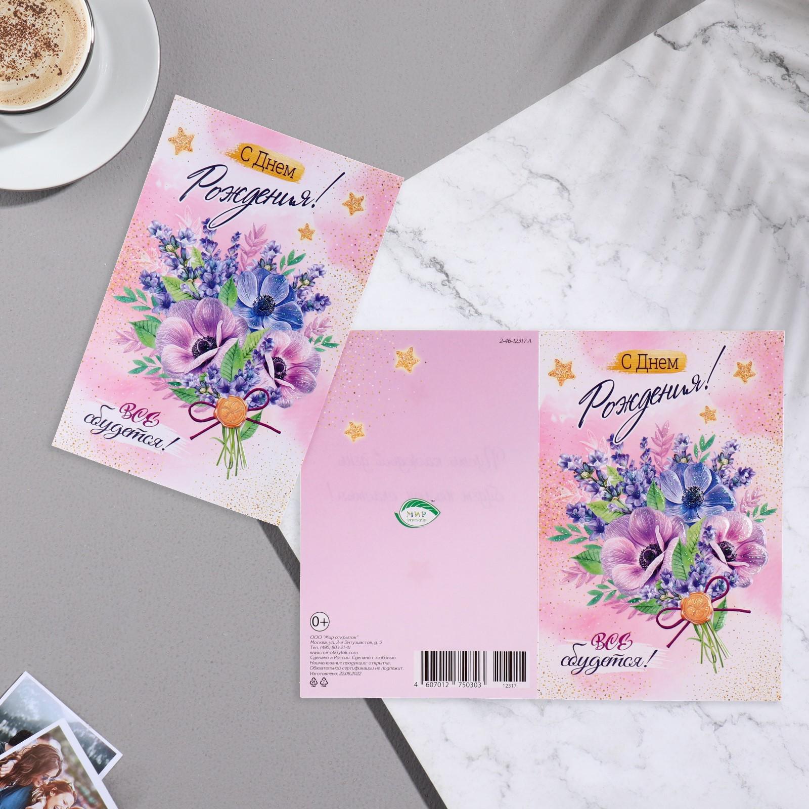 Открытка "С Днём Рождения! Всё сбудет!" конгрев, букет цветов, 12,5х19,4 см