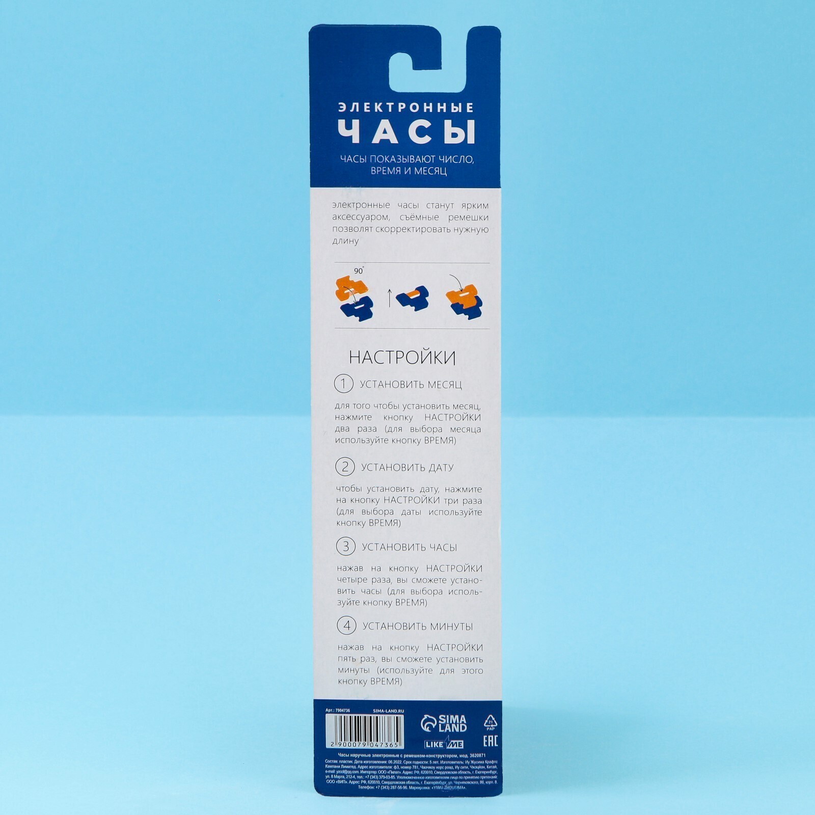Электронные часы с ремешком-конструктором станут ярким аксессуаром вашего ребенка, съемные ремешки позволят скорретировать нужную длину (инструкция по сборке расположена на обороте упаковки). Часы показывают число, время и месяц.