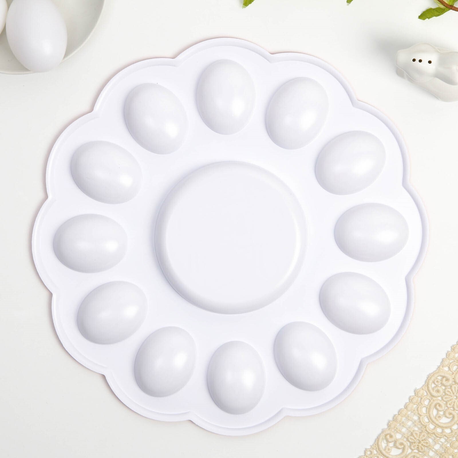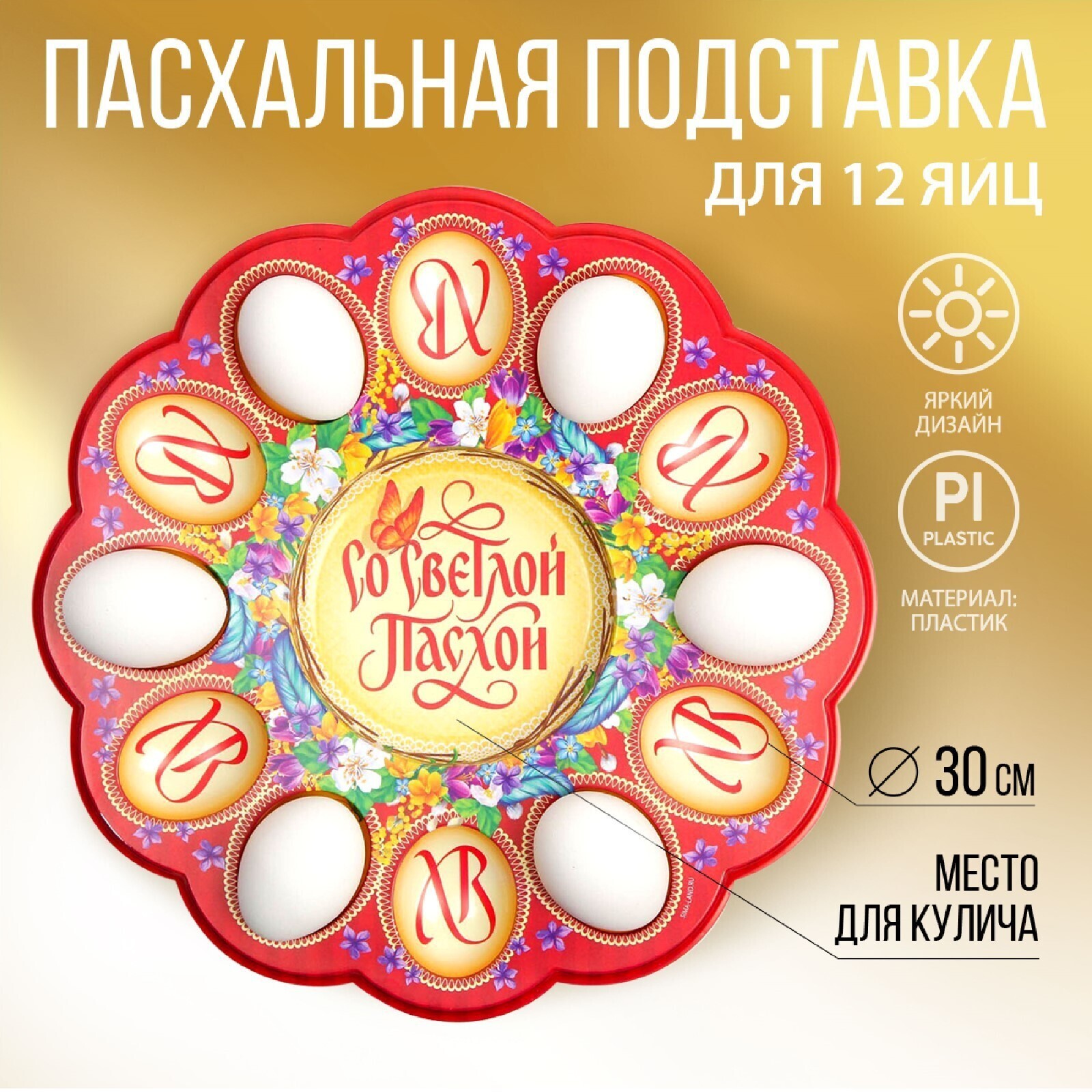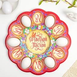 Пасхальная подставка предназначена для праздничного украшения Вашего стола в Светлый День Пасхи. В центре декоративной подставки находится углубление для пасхального кулича диаметром 11,5 см, а по окружности - 12 отверстий для пасхальных яиц. Диаметр декоративной подставки - 30 см.