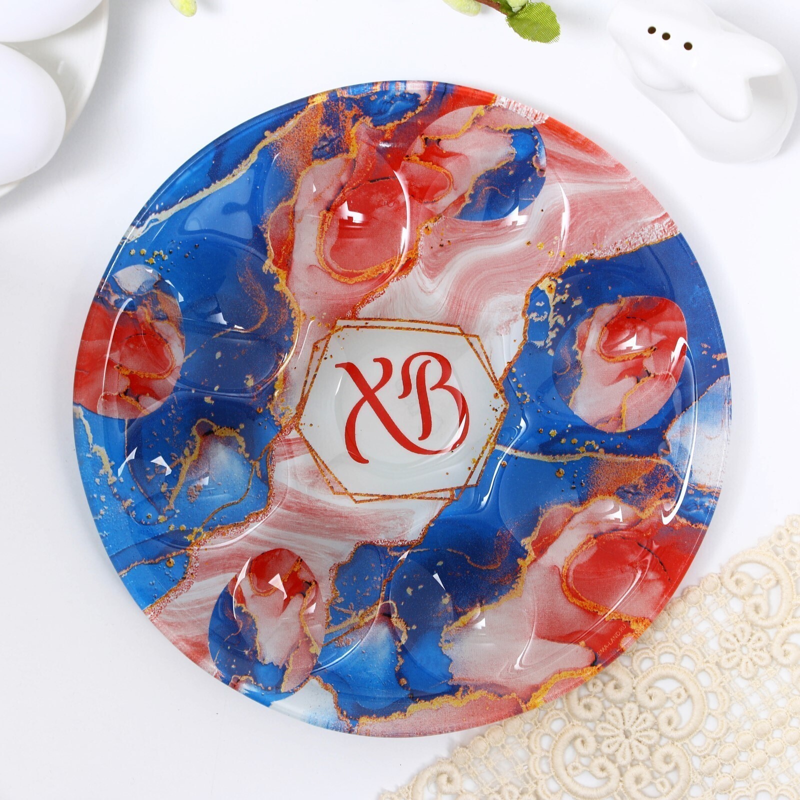Пасхальная подставка предназначена для праздничного украшения Вашего стола в Светлый День Пасхи. По окружности подставки 8 отверстий для пасхальных яиц. Диаметр декоративной подставки - 20,5 см. Декоративная подставка изготовлена из стекла.