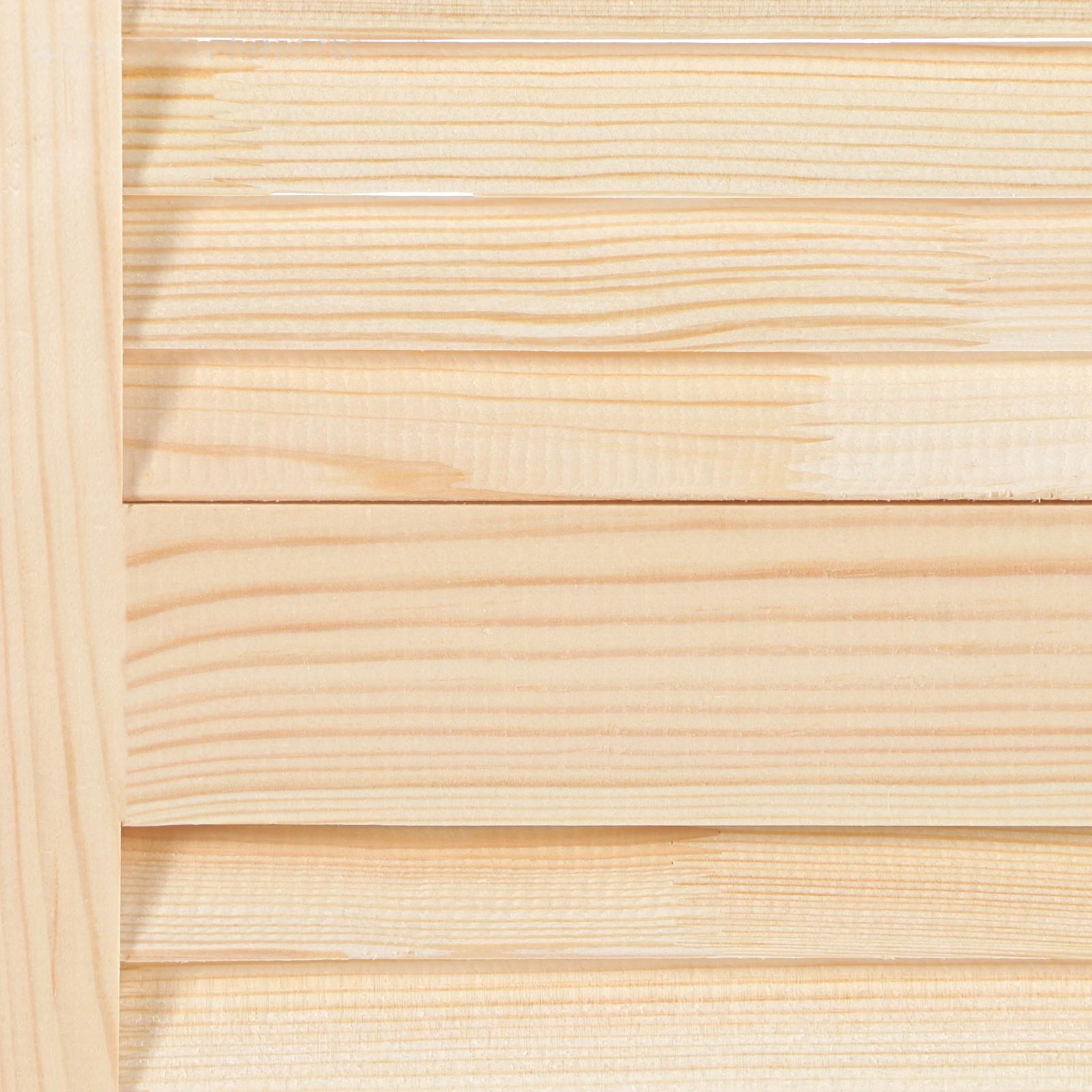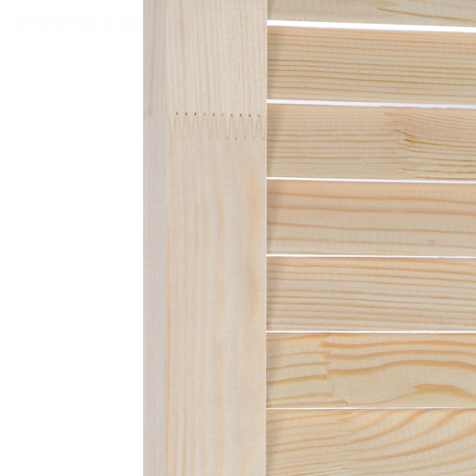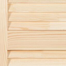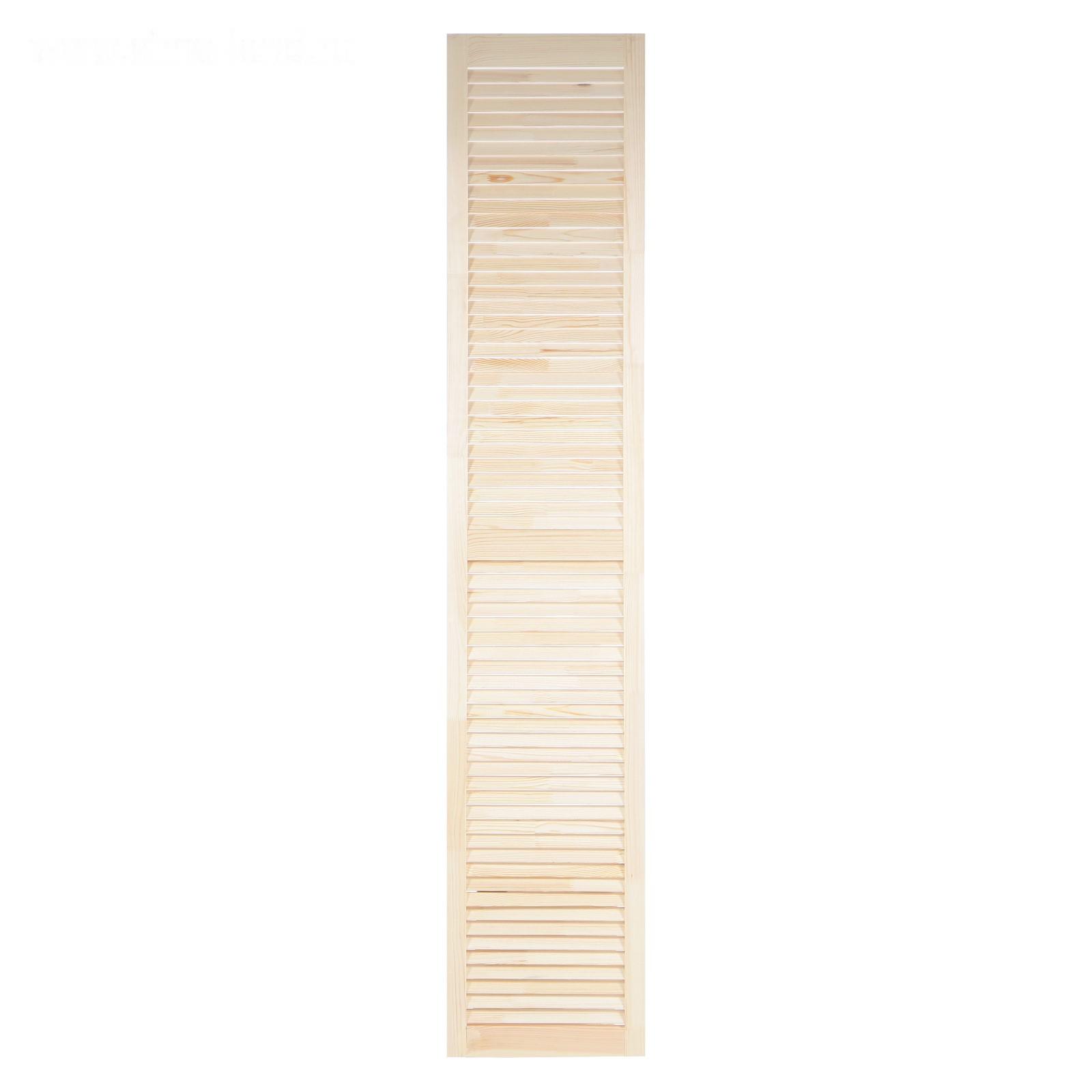 Жалюзийная дверь изготовлена из сосны. Такие двери используются в помещениях, где требуется постоянное проветривание. Также применять жалюзийный фасад можно для шкафов, тумбочек для ванной комнаты, на кухне, балконе или в кладовке. С помощью изделия легко создать уникальный дизайн мебели или обновить её внешний вид.