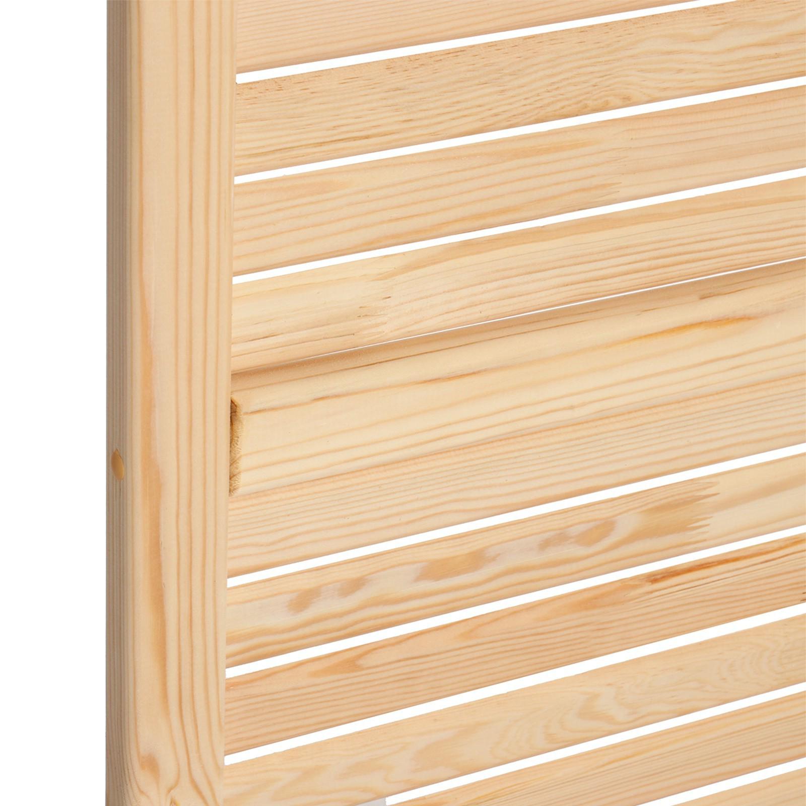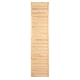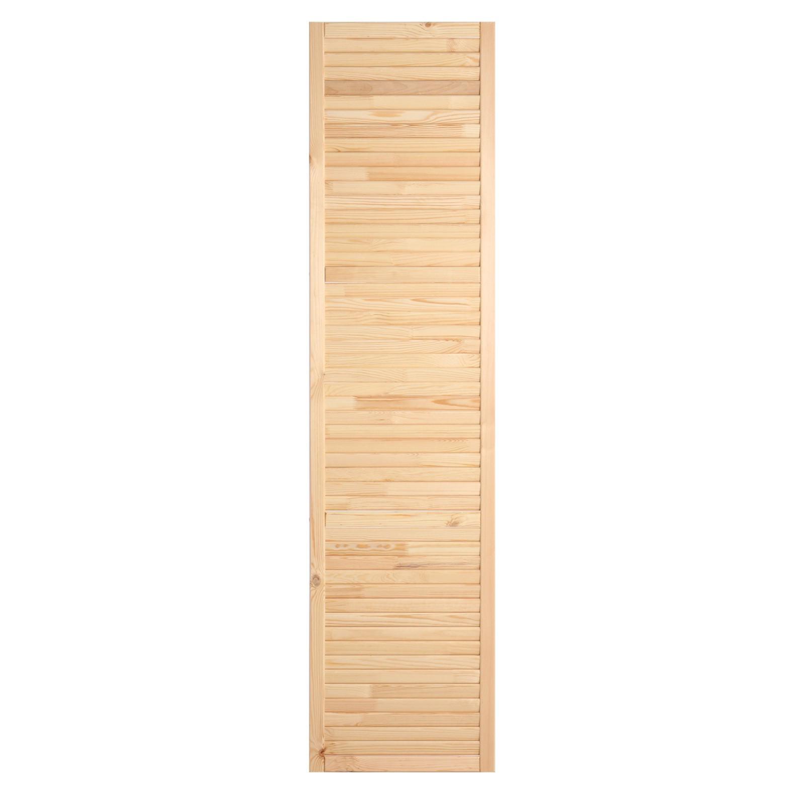 Жалюзийная дверь изготовлена из сосны. Такие двери используются в помещениях, где требуется постоянное проветривание. Также применять жалюзийный фасад можно для шкафов, тумбочек для ванной комнаты, на кухне, балконе или в кладовке. С помощью изделия легко создать уникальный дизайн мебели или обновить её внешний вид.