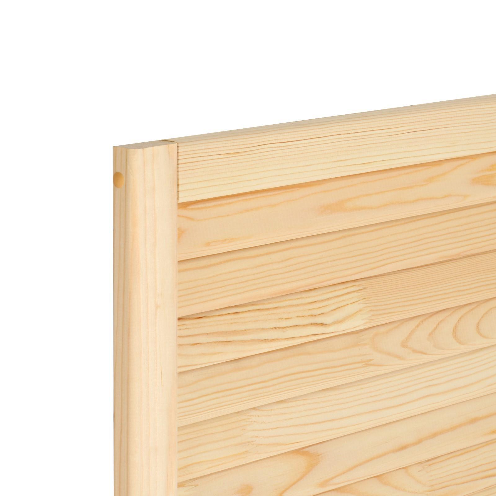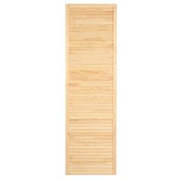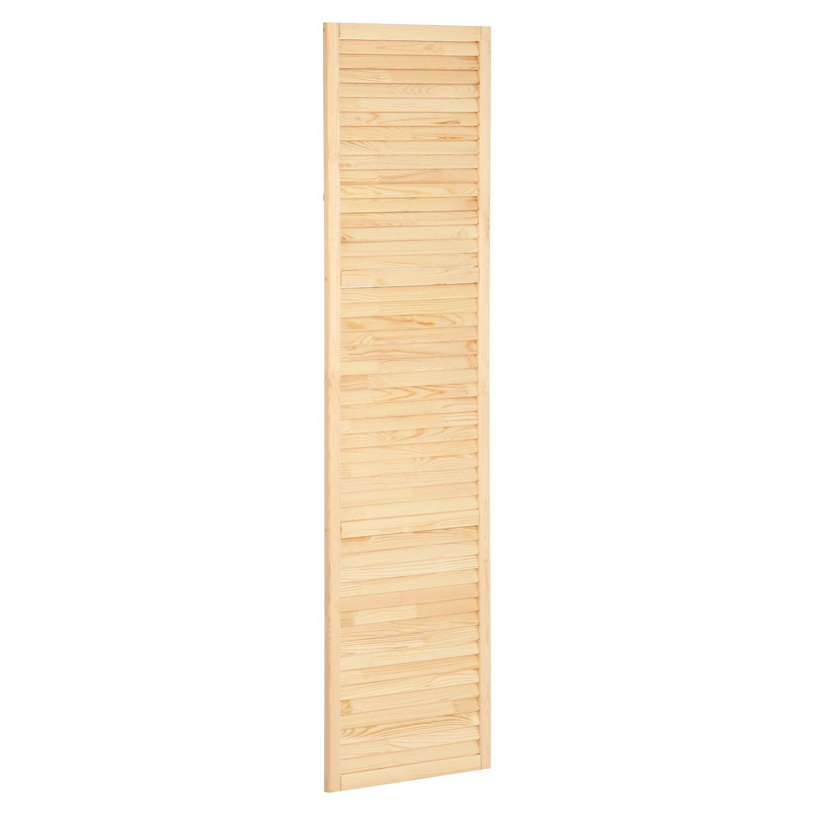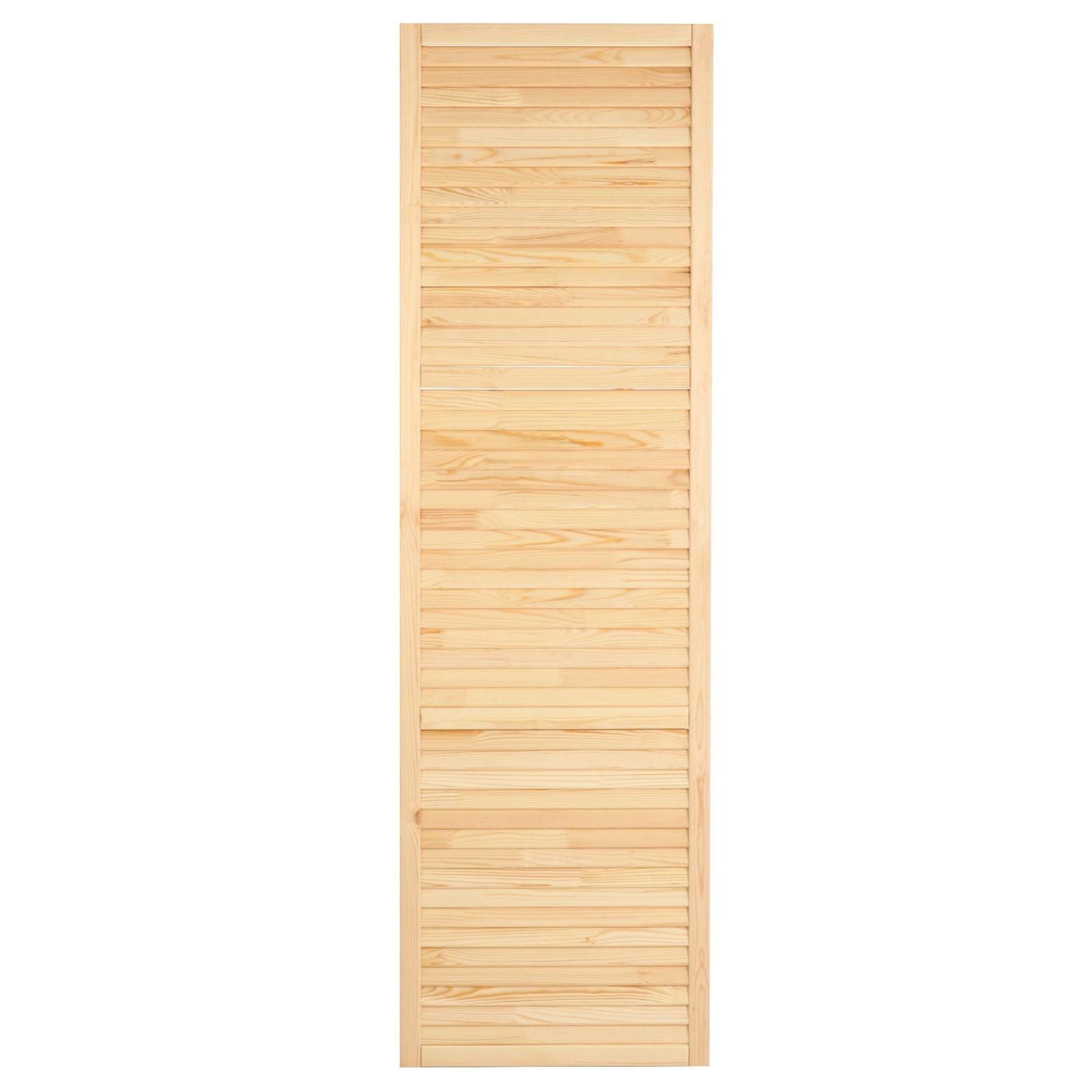 Жалюзийная дверь изготовлена из сосны. Такие двери используются в помещениях, где требуется постоянное проветривание. Также применять жалюзийный фасад можно для шкафов, тумбочек для ванной комнаты, на кухне, балконе или в кладовке. С помощью изделия легко создать уникальный дизайн мебели или обновить её внешний вид.