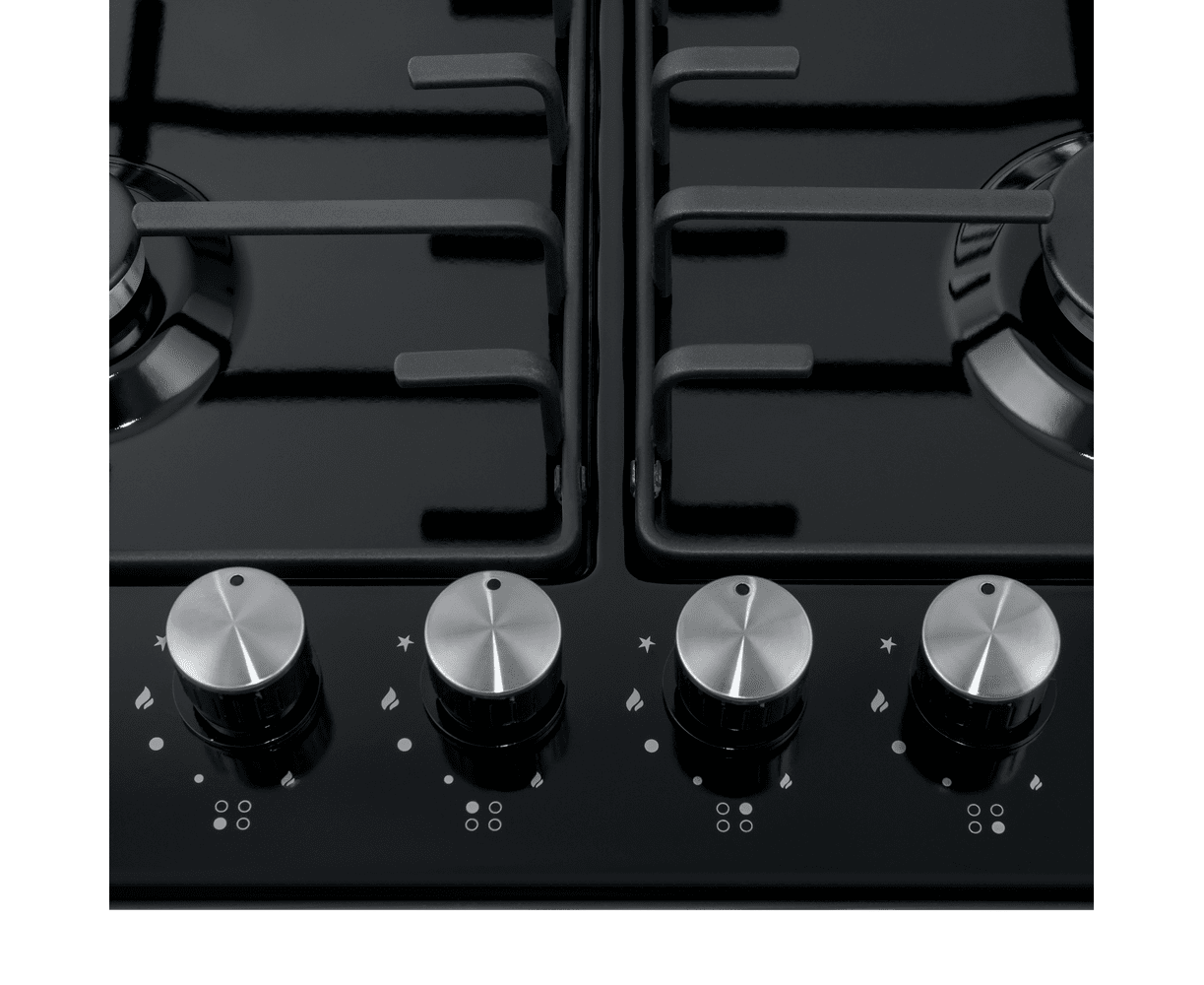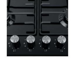 Регулирование подачи газа и электроподжиг конфорок происходит с помощью поворотных ручек из термостойкой пластмассы. Для простоты использования около каждой ручки нанесены информационные изображения: используемая конфорка, подача газа выключена, электроподжиг, максимальное пламя и минимальное пламя.