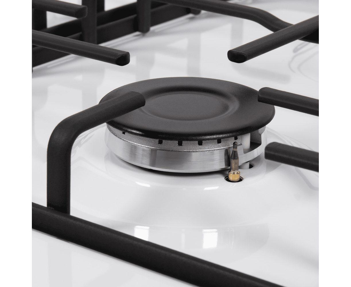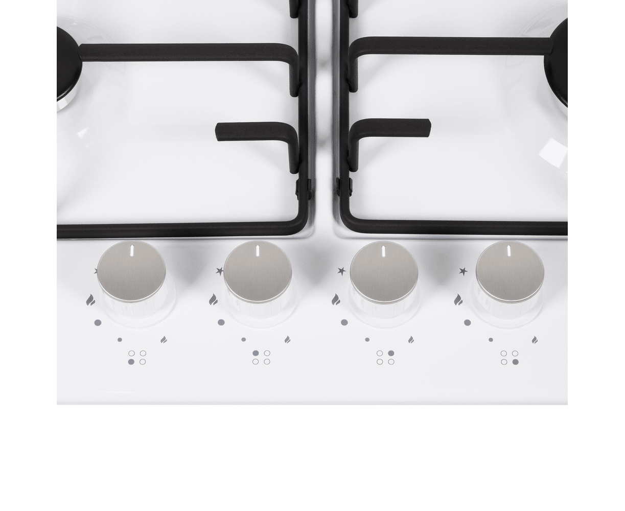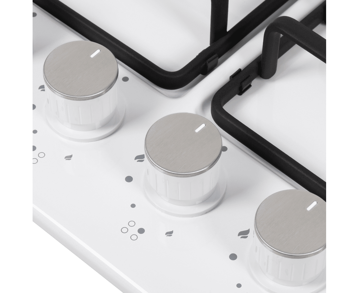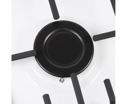 Панель белого цвета выполнена из нержавеющей стали с износостойким покрытием из эмали. В данной модели установлены высококачественные итальянские горелки SABAF (4 конфорки). Четыре стандартные конфорки мощностью 1000 Вт, 1700 Вт, 1700 Вт и 2600 Вт спроектированы таким образом, что огонь не перегревает ни эмалированные решетки, ни ручки управления.
