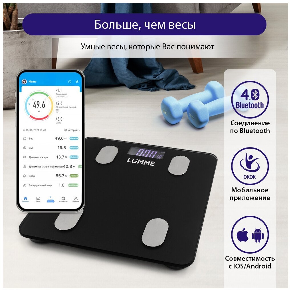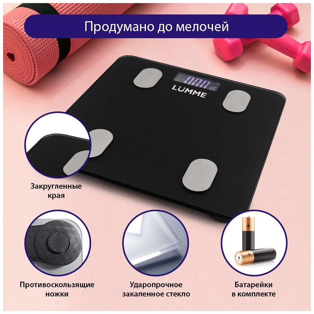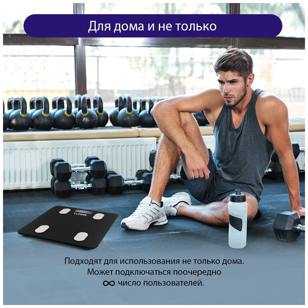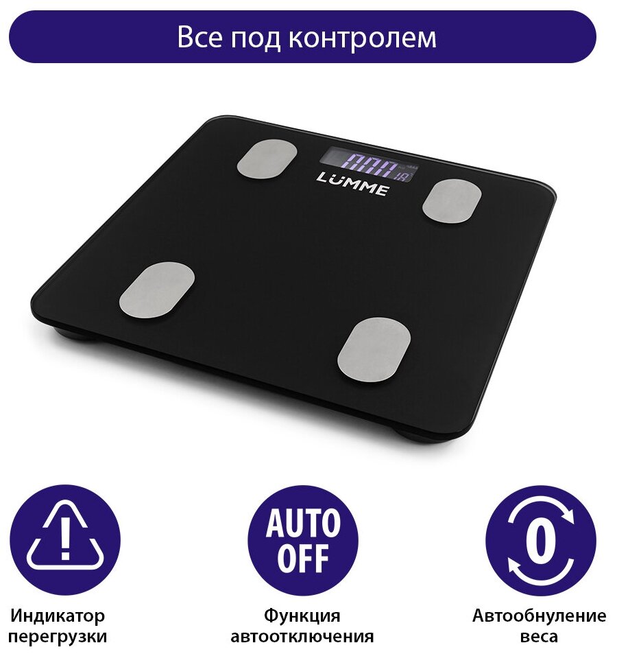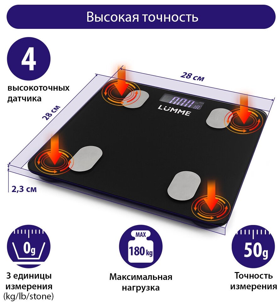 Напольные весы LUMME LU-1334 – умные диагностические весы с 4 сенсорами, ЖК дисплеем и синхронизацией с телефоном на Ios и Android. Используются для измерения уровня жира, воды, мышечной и костной массы. Весы обеспечивают взвешивание до 180 килограммов с точностью до 50 граммов, способны работать в различных единицах измерения веса (килограмм / фунт / стоун), в диапазоне значений роста от 75 до 225 сантиметров и в диапазоне значений возраста от 10 до 85 лет. 8 ячеек памяти для фиксации информации об изменении в весе каждого члена семьи. Встроенный термометр определит температуру помещения. Для экономии заряда батарей весы отключаются автоматически, если не используются, а индикаторы перегрузки и замены батареи сделают работу весов бесперебойной в течение длительного времени.