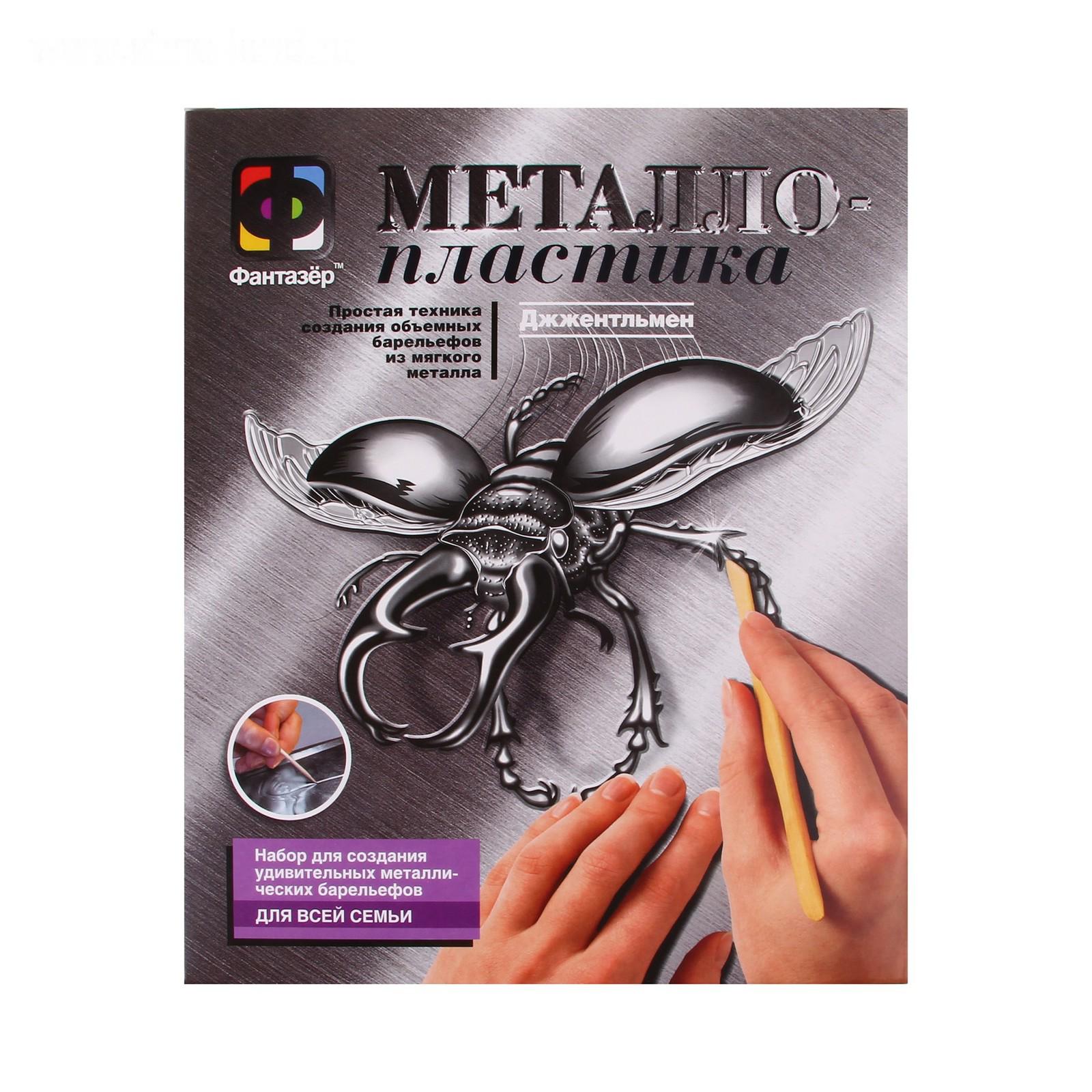 набор для творчества металлопластика Джжентельмен №2 жук 437002 18,5*22*2,5 см - замечательная возможность для Вашего ребенка получить первые навыки создания объемных изображений на мягком металле. С помощью этой несложной техники можно изготовить чудесное панно, которое станет оригинальным подарком или украшением интерьера.