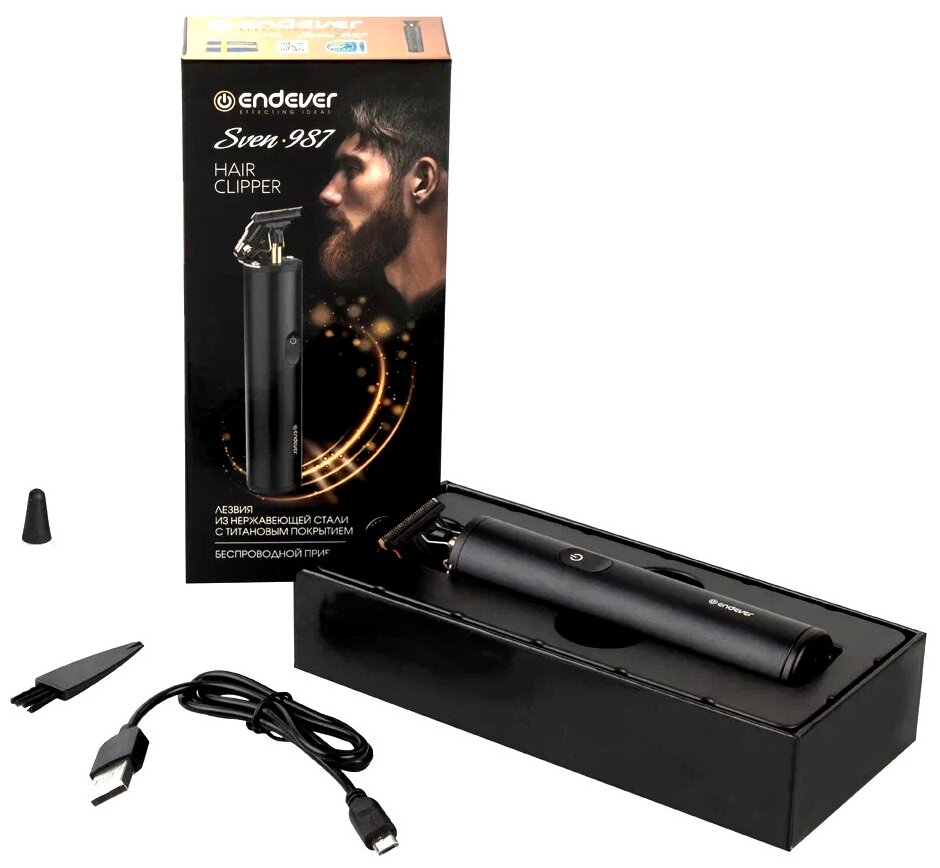 Машинка Endever Sven-987 с легкостью поможет вывести идеально ровную, четкую линию или кант. Sven-987 оснащена съемным профессиональным лезвием из нержавеющей стали с титановым напылением и подвижными лезвиями из керамики. Такая технология дает феноменальную плавность работы и позволяет достигать отличного результата при бритье. Лезвия невероятно долговечны, а дополнительным приятным моментом сочетания стали, титана и керамики является абсолютно бесшумная работа. Мы уверены в этой технологии и единственные, кто готов предложить 25 месяцев гарантии. Машинка с легкостью поможет вывести идеально ровную, четкую линию или кант. Оснащена литий-ионным аккумулятором на 600 mAh. Время работы от аккумулятора более 90 минут непрерывной работы. При этом обладает высокоскоростным электромотором и функцией работы от сети. Такое сочетание характеристик обеспечивает выдающуюся производительность триммера. Endever Sven-987 оснащена лезвиями, которая позволяет использовать их для бритья, стрижки, филировки, прореживания и подравнивания бороды. Воссоздавайте Ваш любимый стиль где угодно: дома, в путешествиях или в дороге!