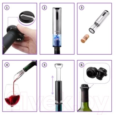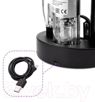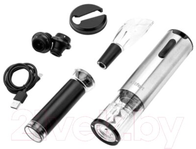 • В наборе подставка, штопор, кабель для зарядки, пробка для бутылки, вакуумный насос, прибор для снятия фольги, аэратор барный
