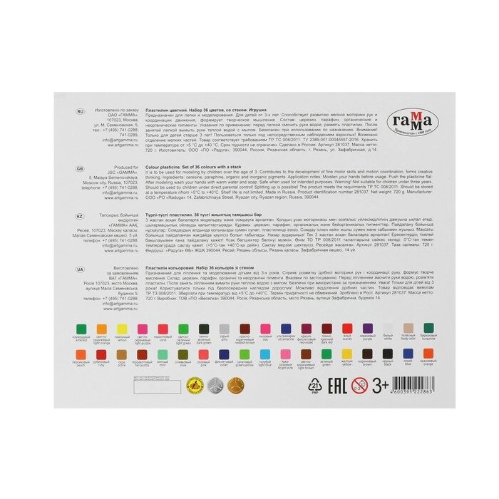 Пластилин 36 цветов 720 г, «Гамма»Классический», со стеком