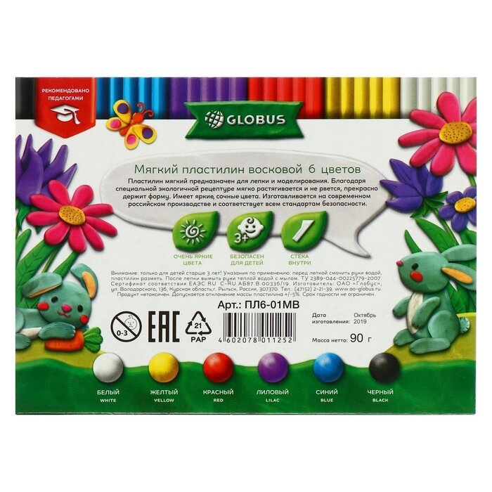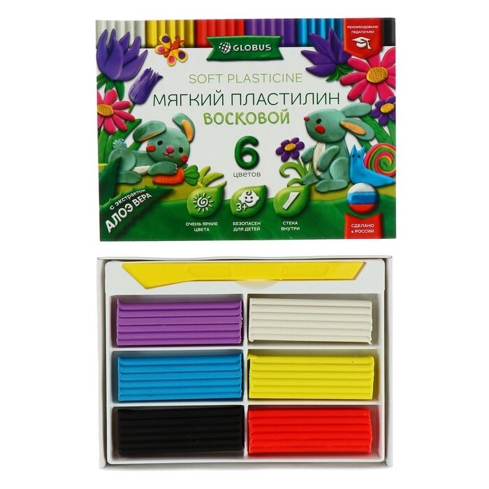 Пластилин мягкий восковой, 6 цветов 90 г GLOBUS, с экстрактом алоэ вера, со стеком