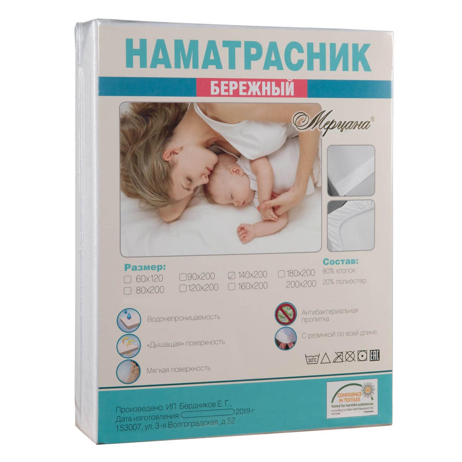 Бережный наматрасник изготовлен из ткани мулетон (80 % хлопка и 20 % п/э). Изделие превосходно защищает спальное место от непредвиденных ситуаций, так как в его структуре находится водонепроницаемая мембрана.