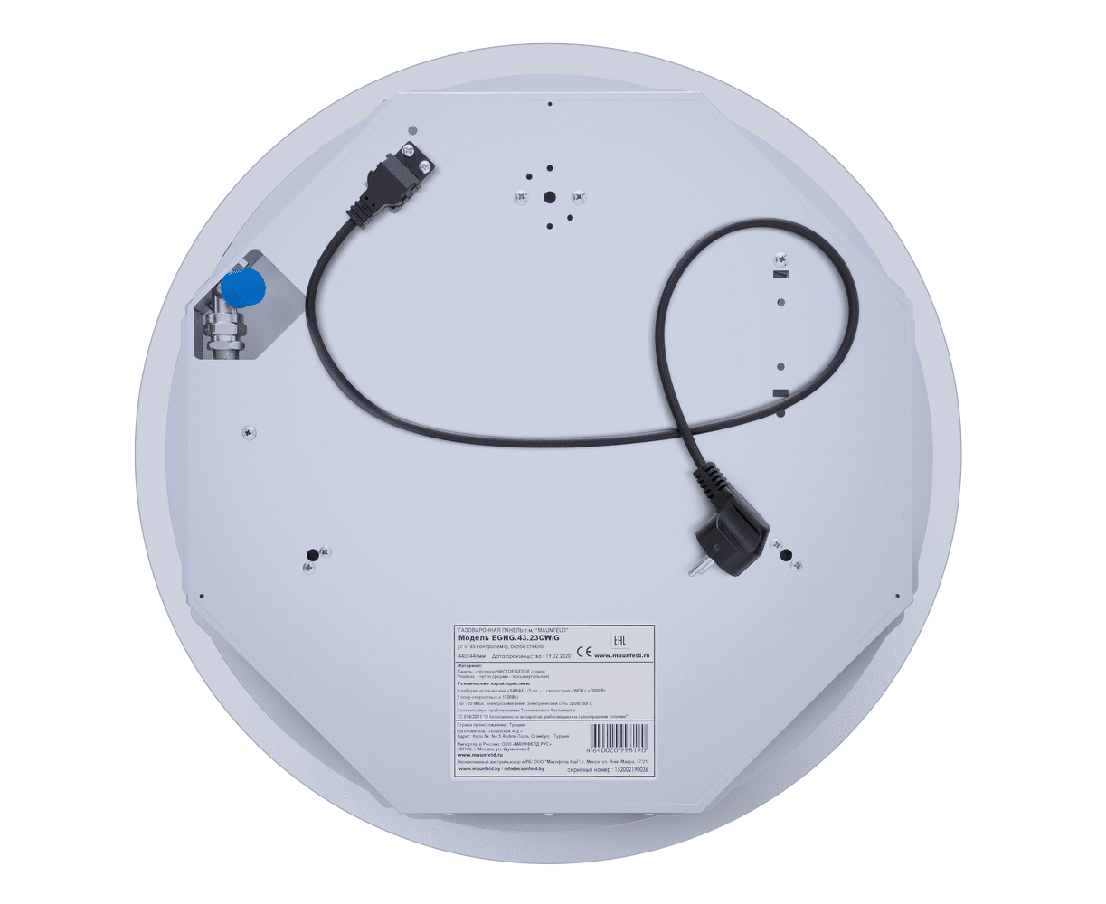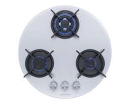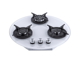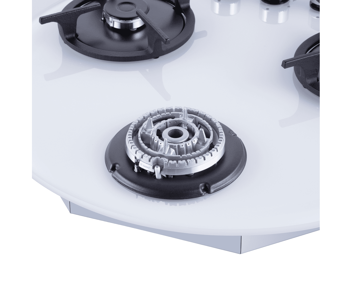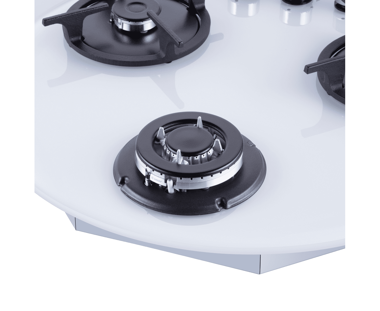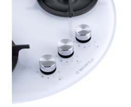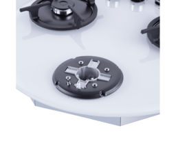 Панель выполнена из закаленного стекла белого цвета. В данной модели установлены высококачественные итальянские горелки SABAF (3 конфорки). Две стандартные конфорки мощностью 1000 Вт и 1700 Вт и одна мощная WOK-конфорка с двойным пламенем мощностью 3000 Вт. Укомплектованы круглыми чугунными решетками.