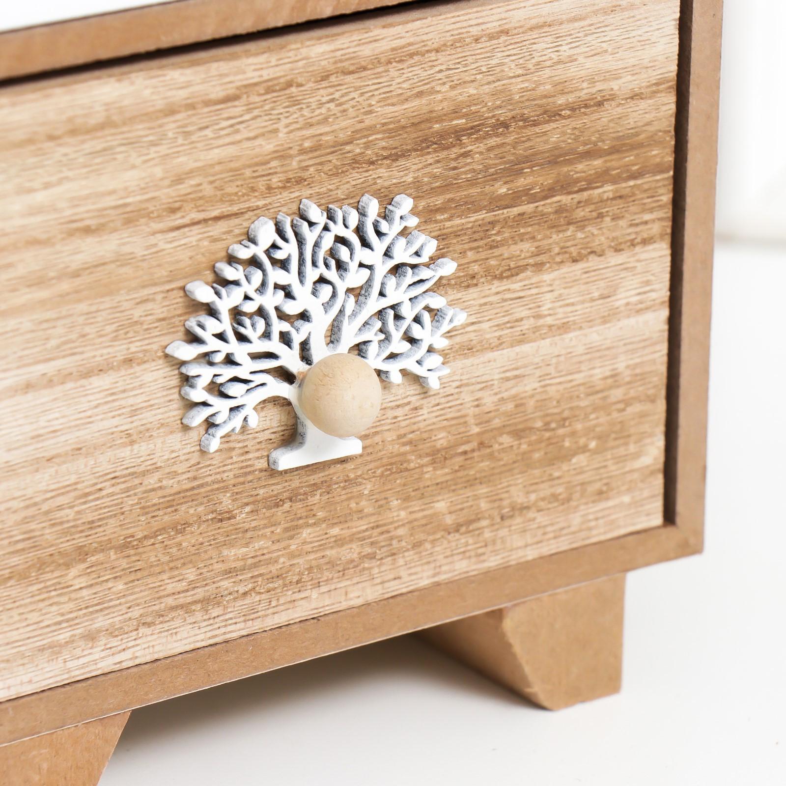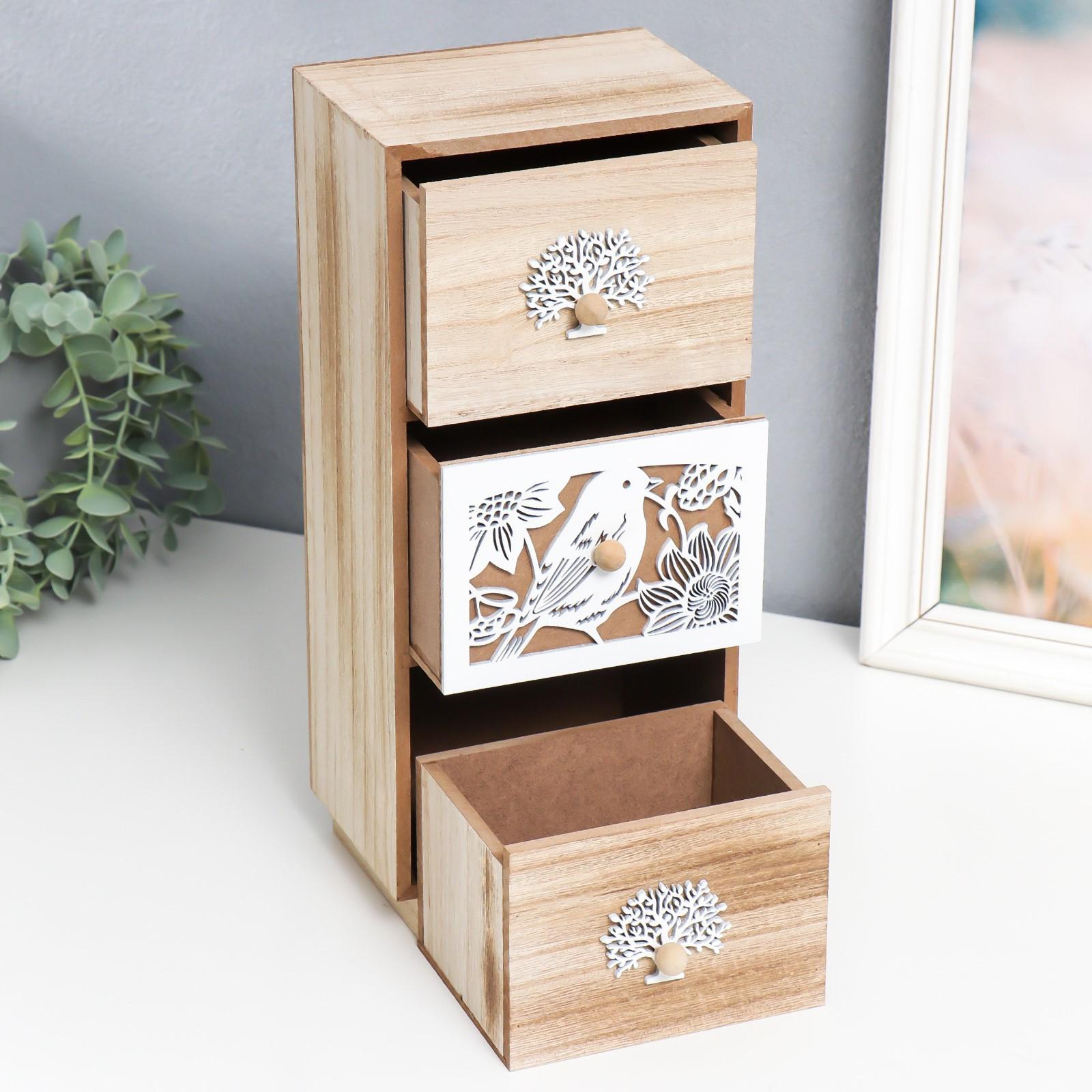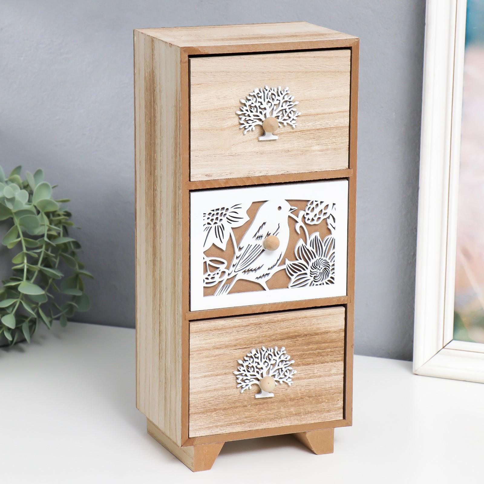 Шкатулка дерево комод 3 ящика "Дерево и птичка" бежево-белая 10х14х31,8 см