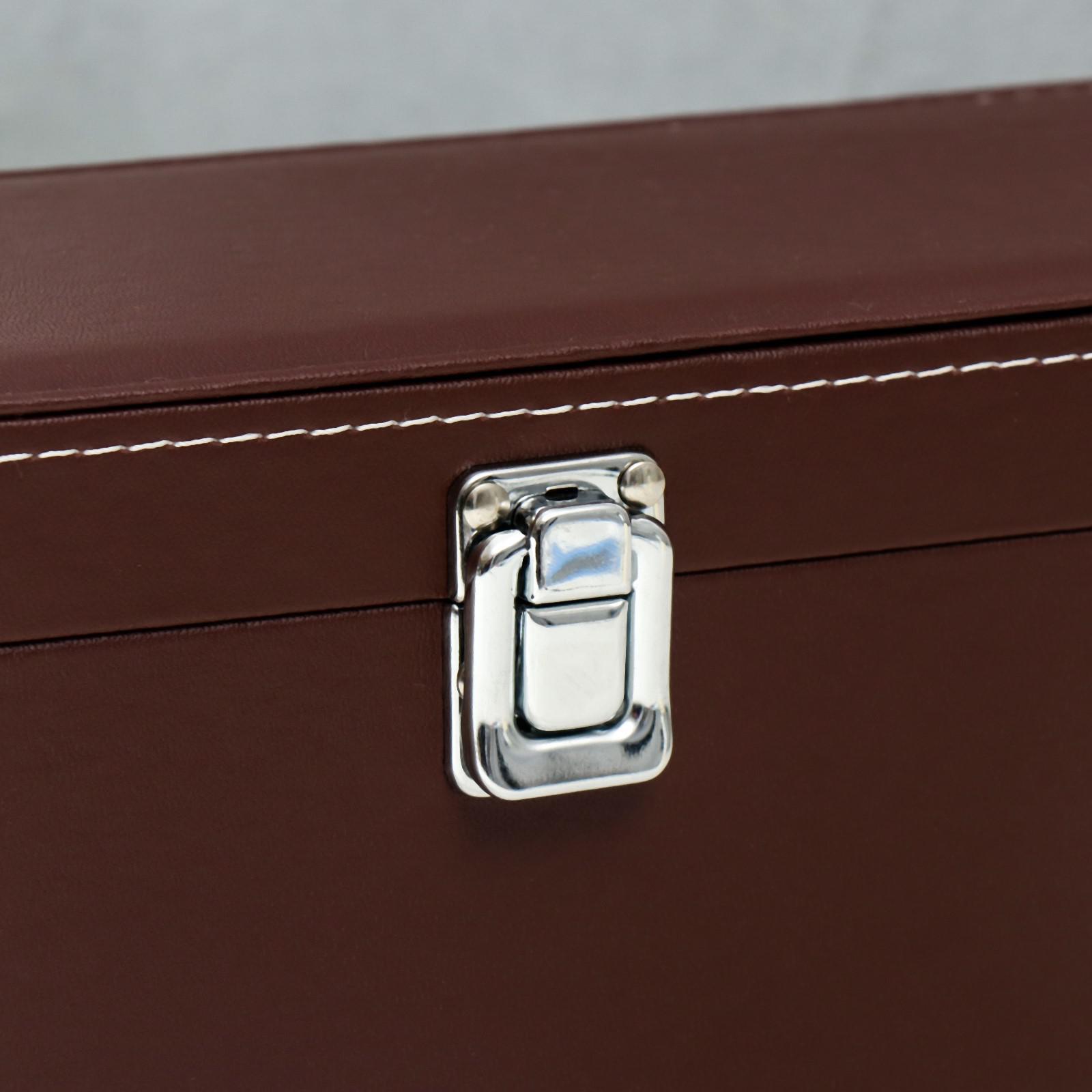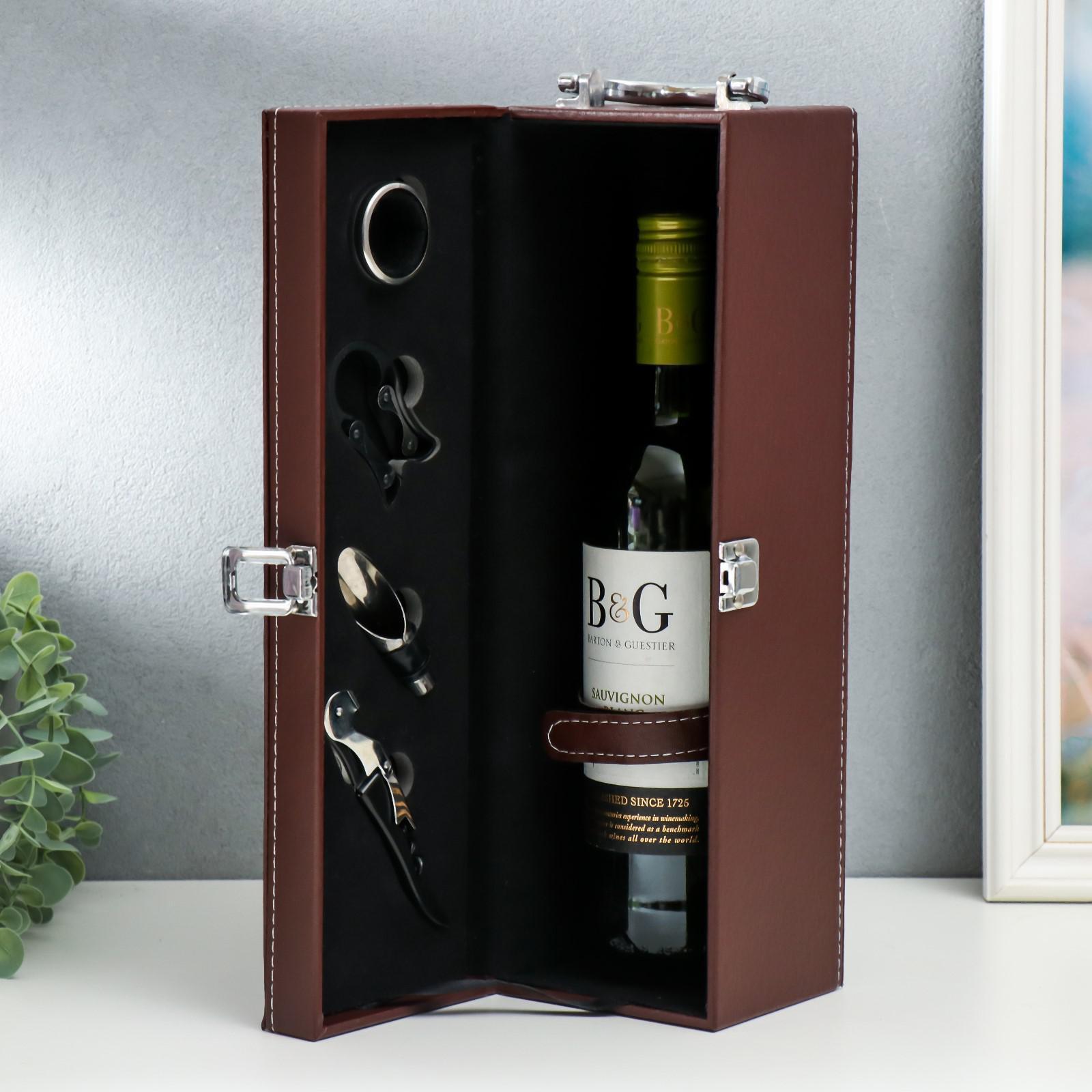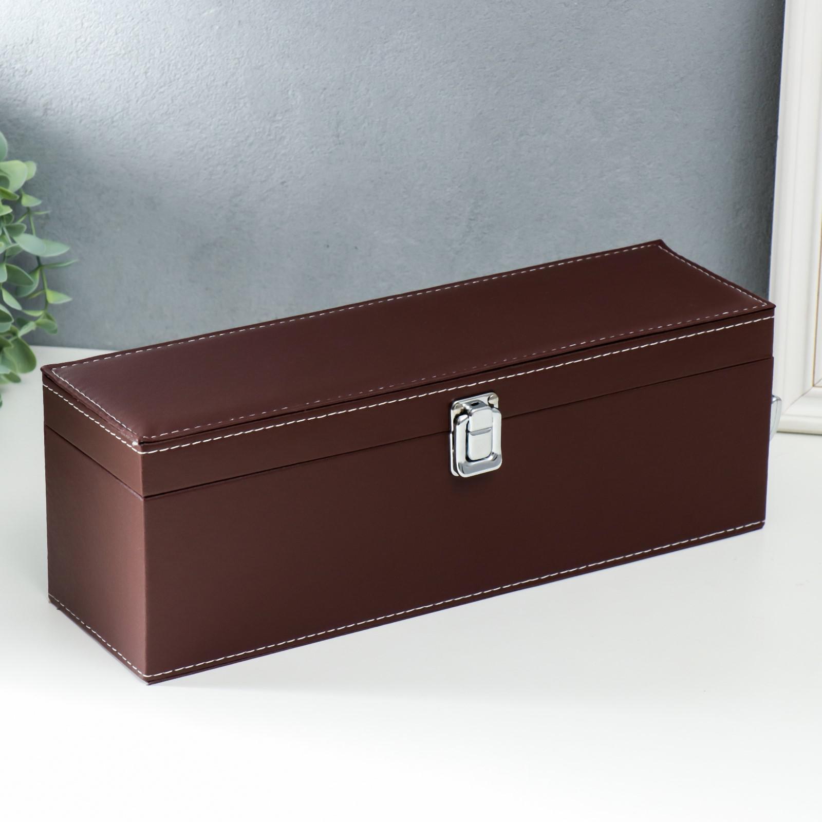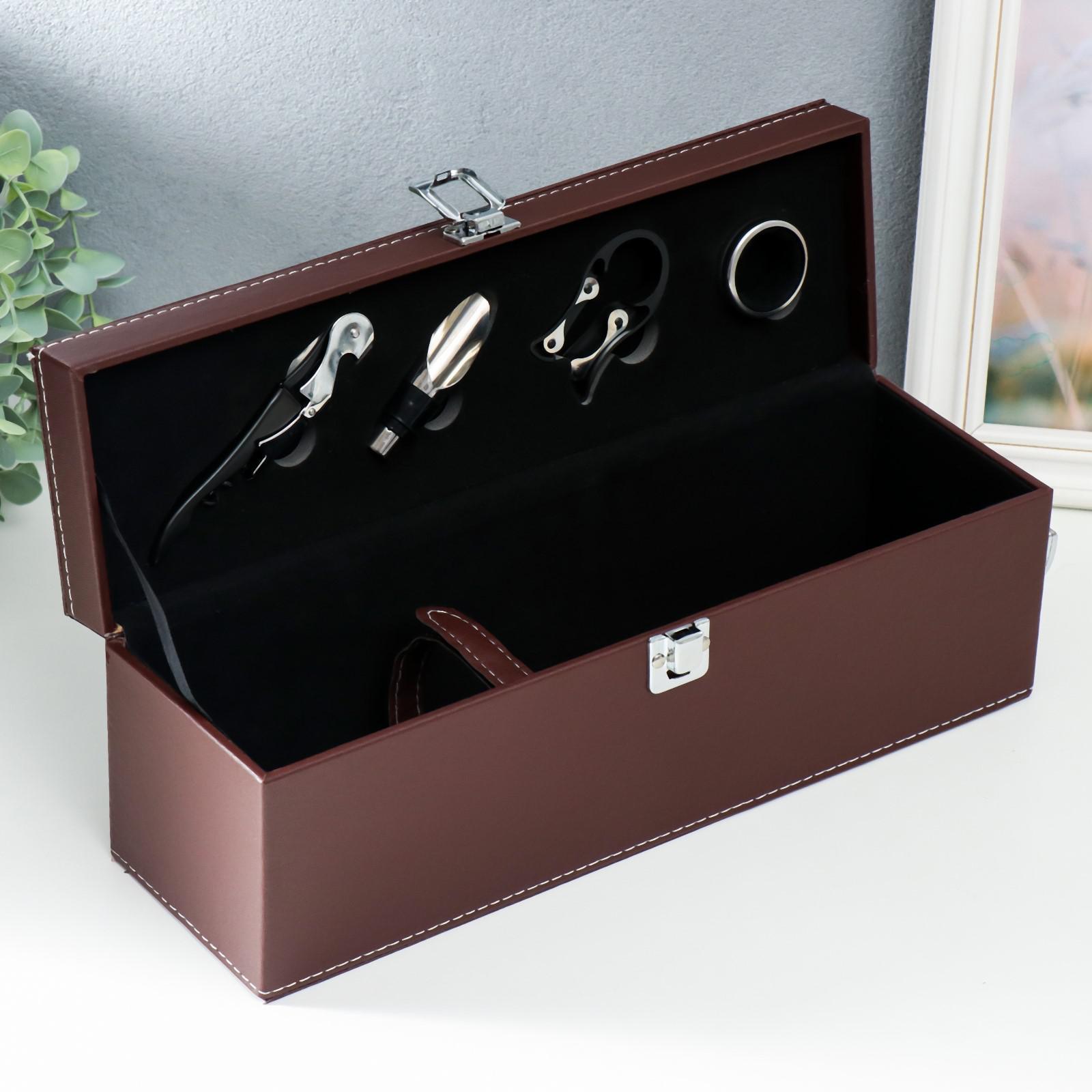 Шкатулка дерево, кожзам под бутылку "Коричневая с белой строчкой" 4 предмета 36х11х12 см