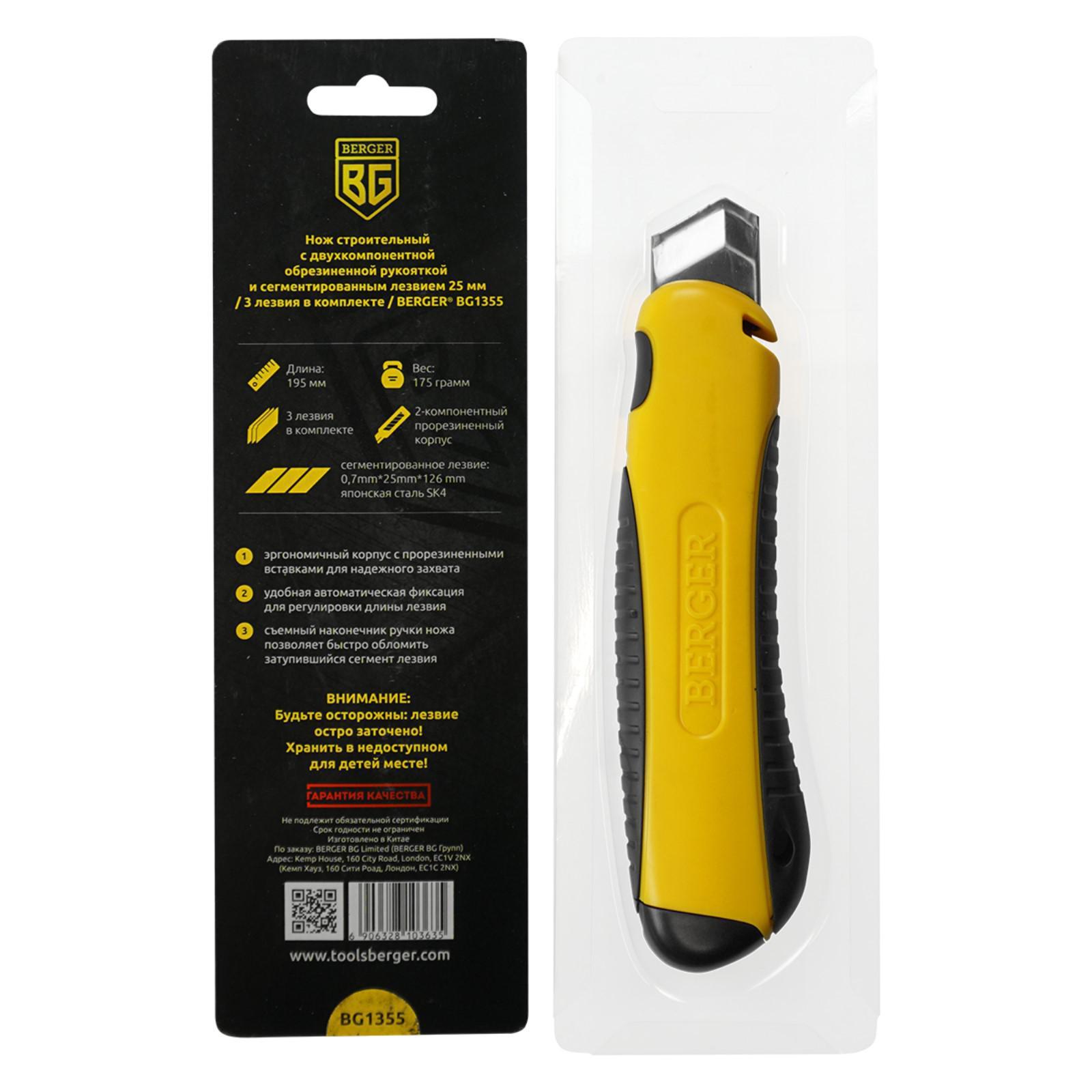 Нож строительный BERGER BG1355, двухкомпонентная обрезиненная рукоятка, 25 мм