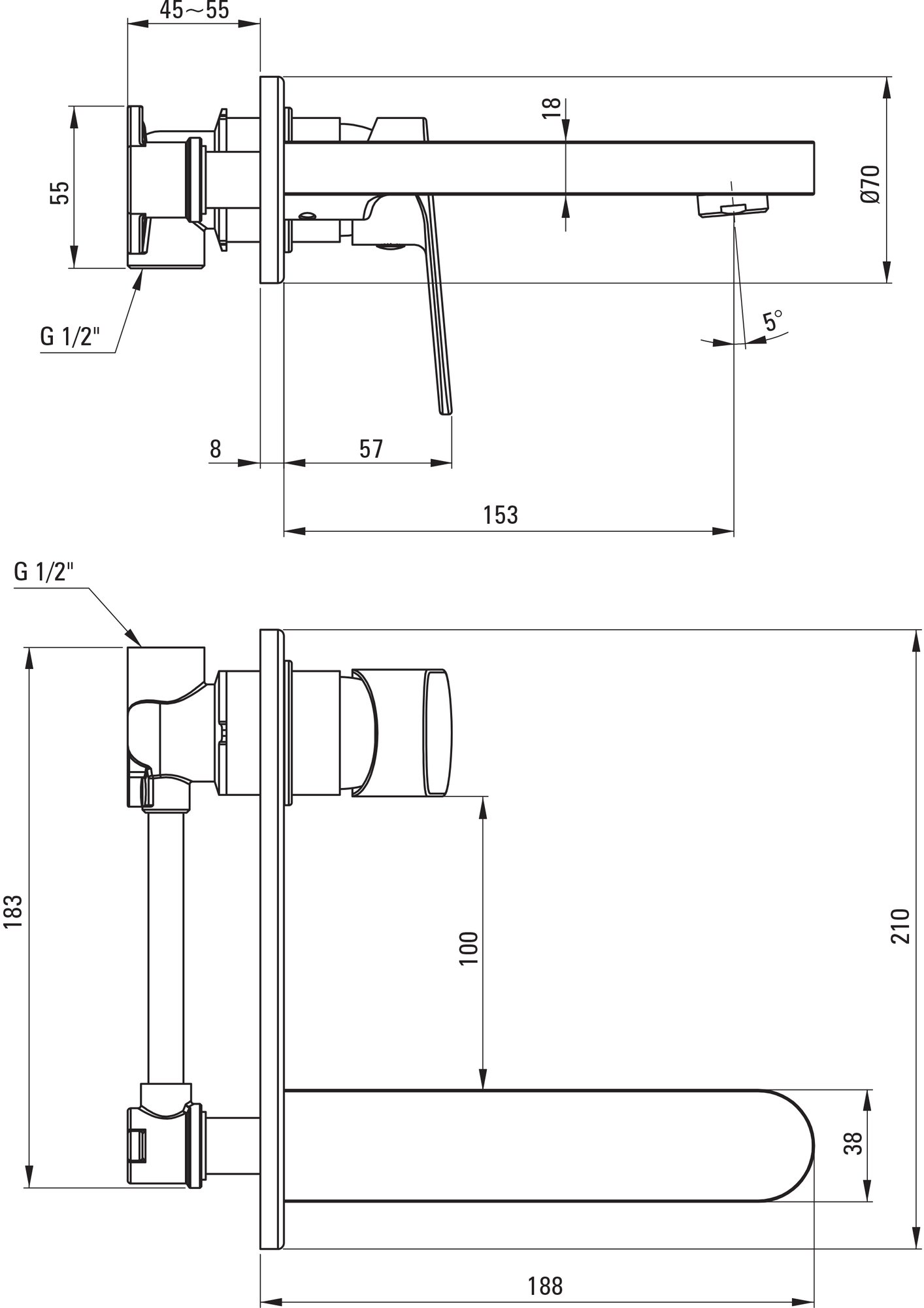 Длина излива - 153 мм