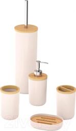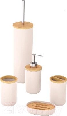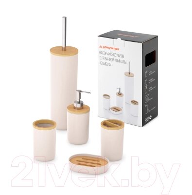 - Комплектация набора мыльница, стакан для зубных щеток, ершик для унитаза, стакан косметический, дозатор жидкого мыла