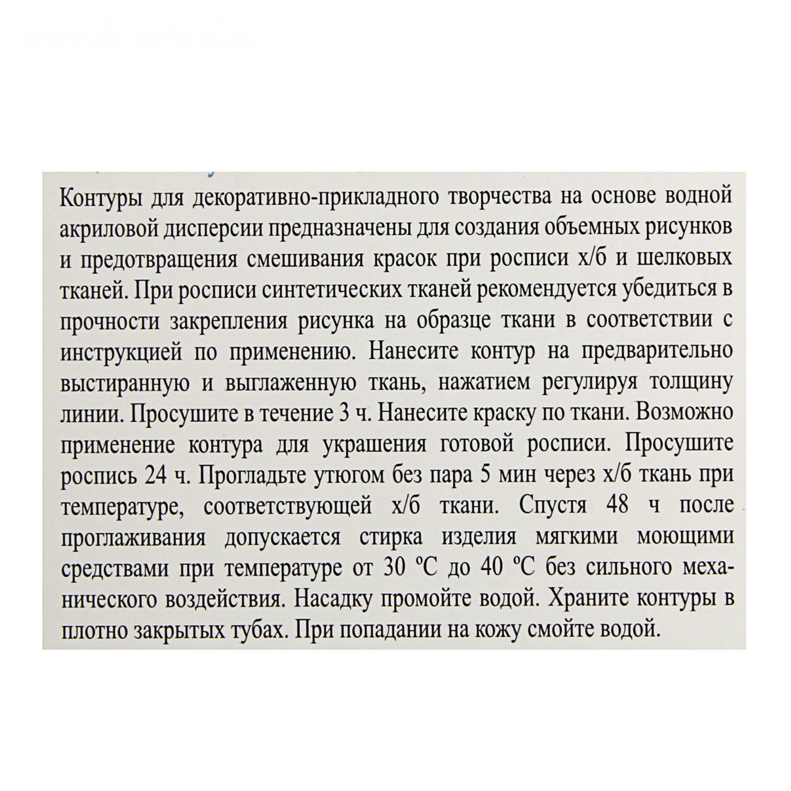 Контуры для декоративно-прикладного творчества на основе водной акриловой дисперсии предназначены для создания объемных рисунков и предотвращения смешивания красок при росписи х/б и шелковых тканей.