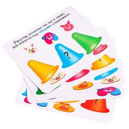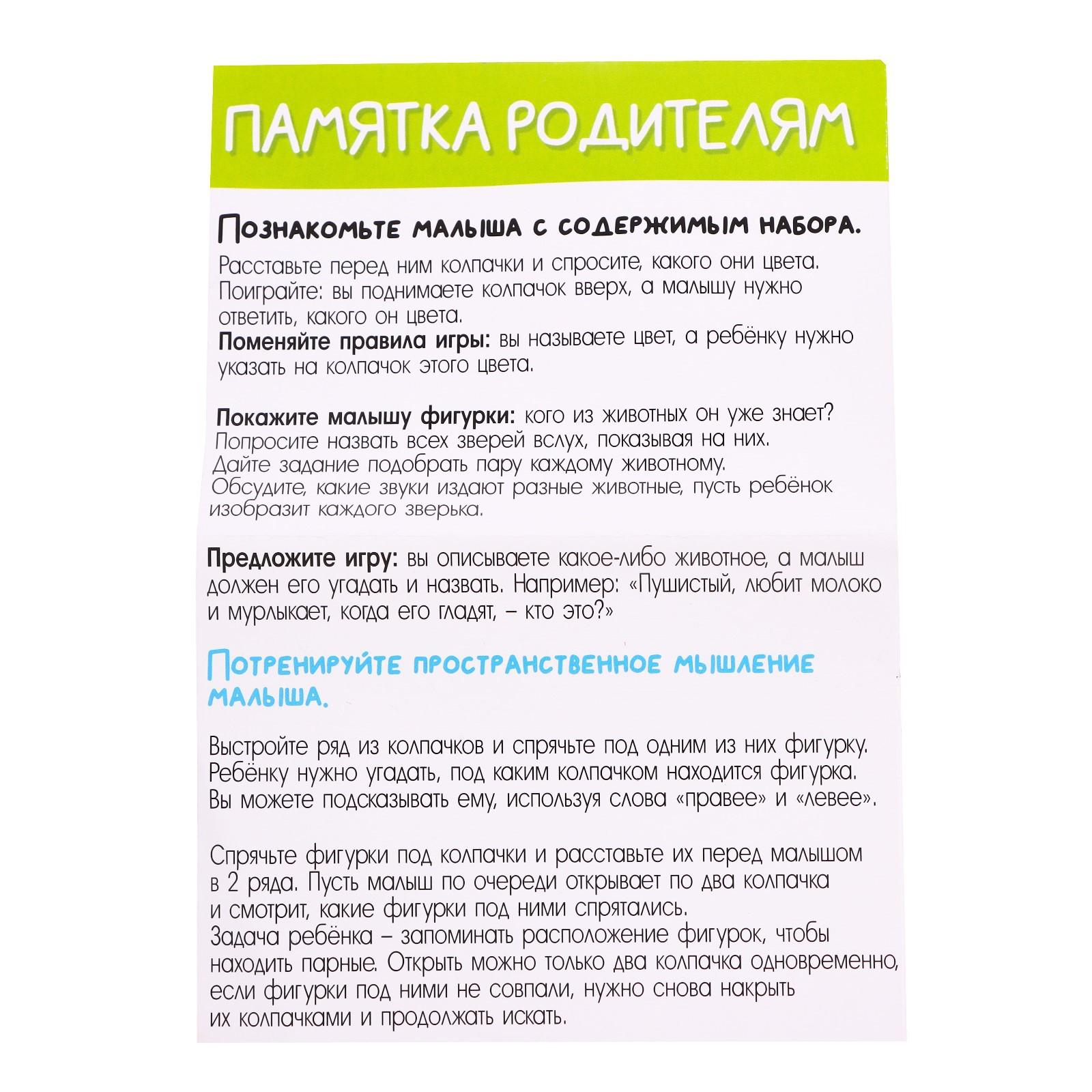Расположите 5 колпачков перед ребёнком. Попросите его отвернуться. Спрячьте зверька под любым колпачком. Пусть маленький детектив расследует дело и скажет, где же находится пропажа.