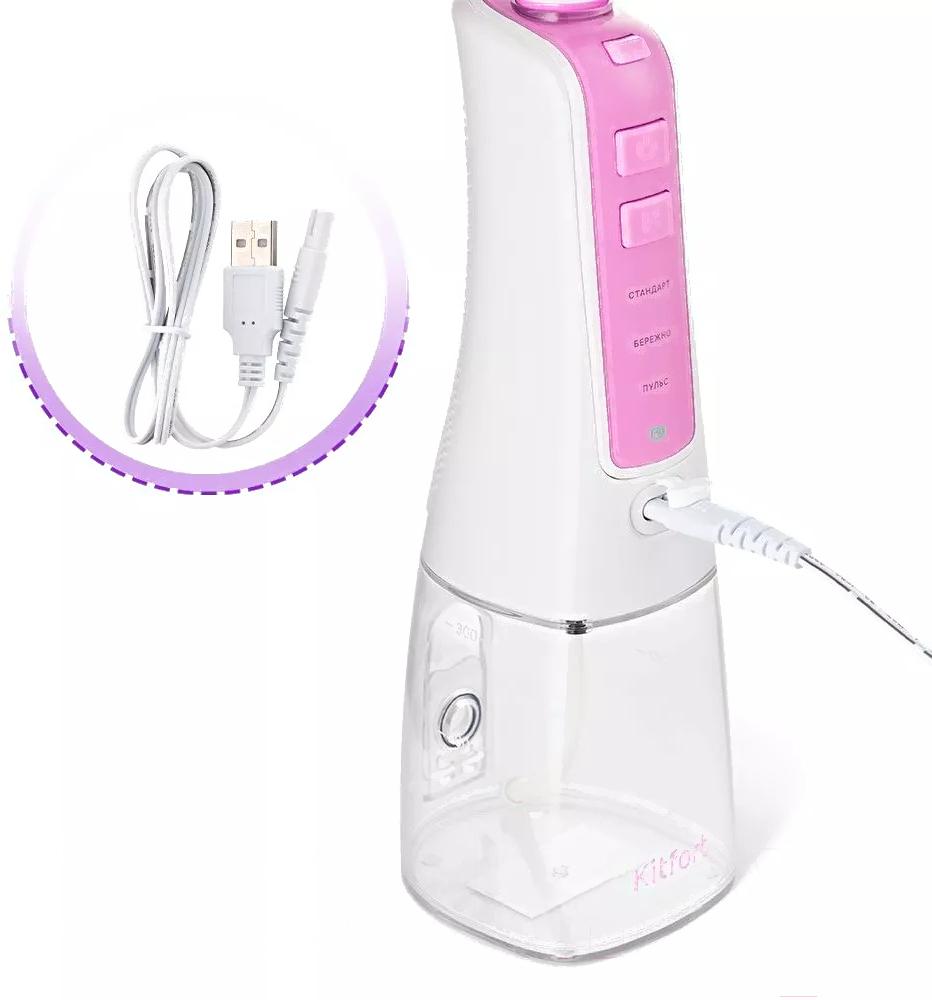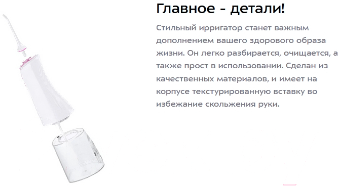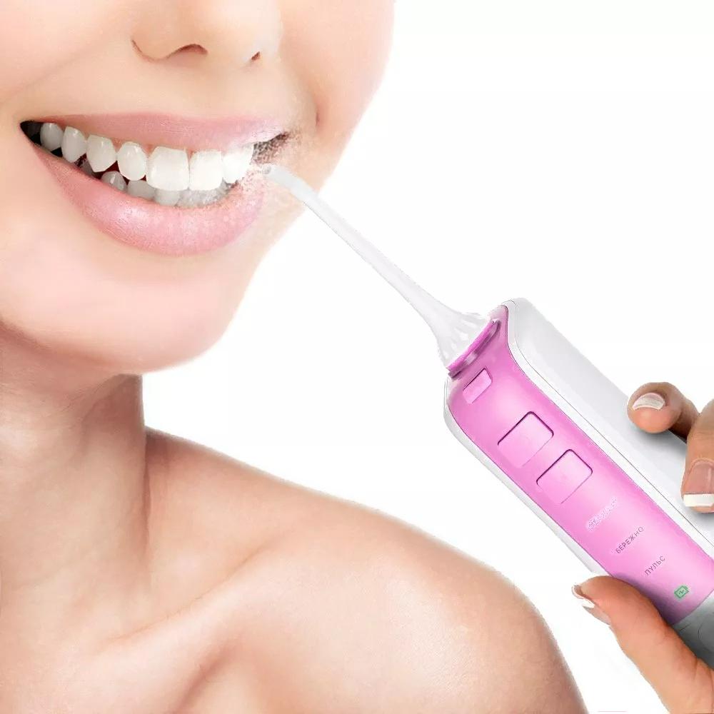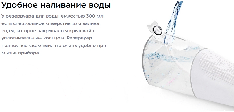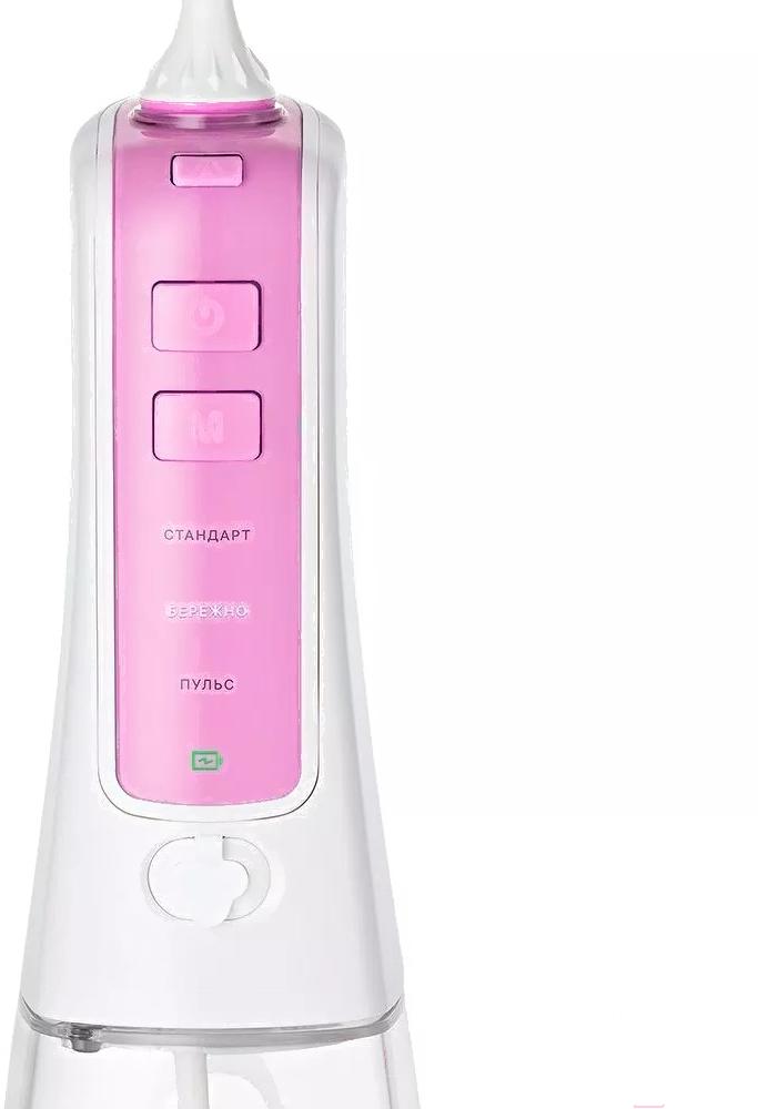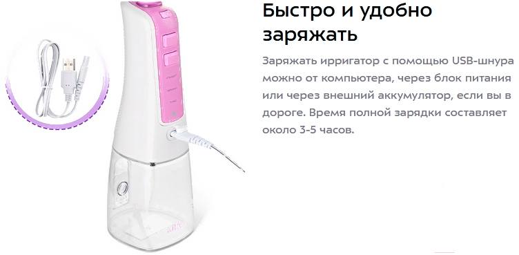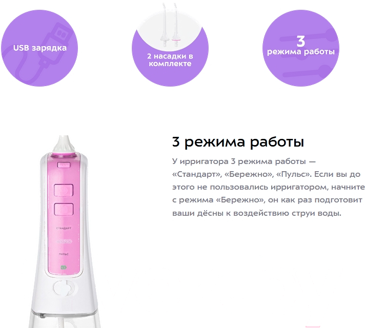 В комплектерезервуар для жидкости (300 мл), индивидуальные насадки, зарядное устройство (USB-шнур, длина — 0.7 м), ирригатор, чехол, инструкция