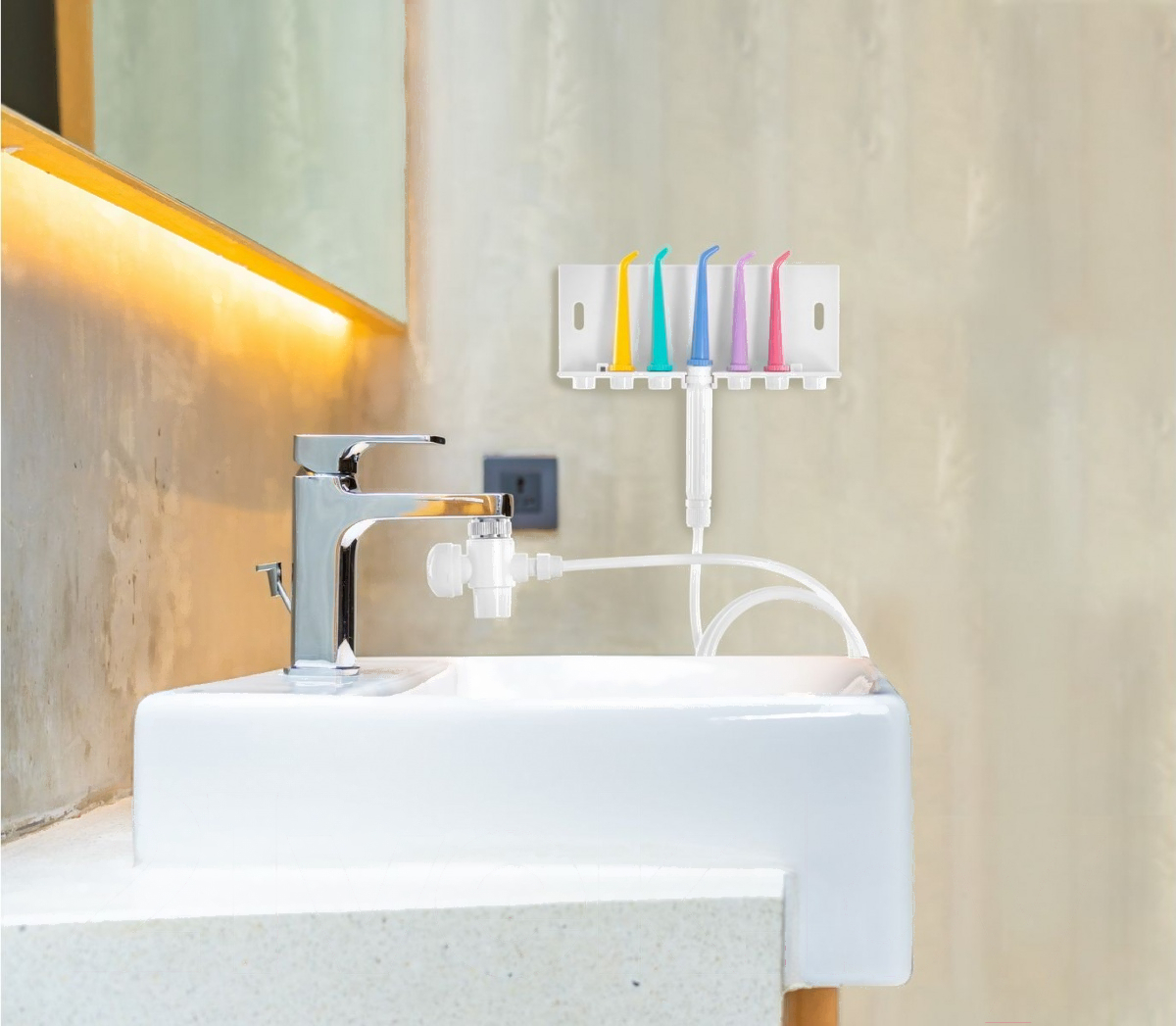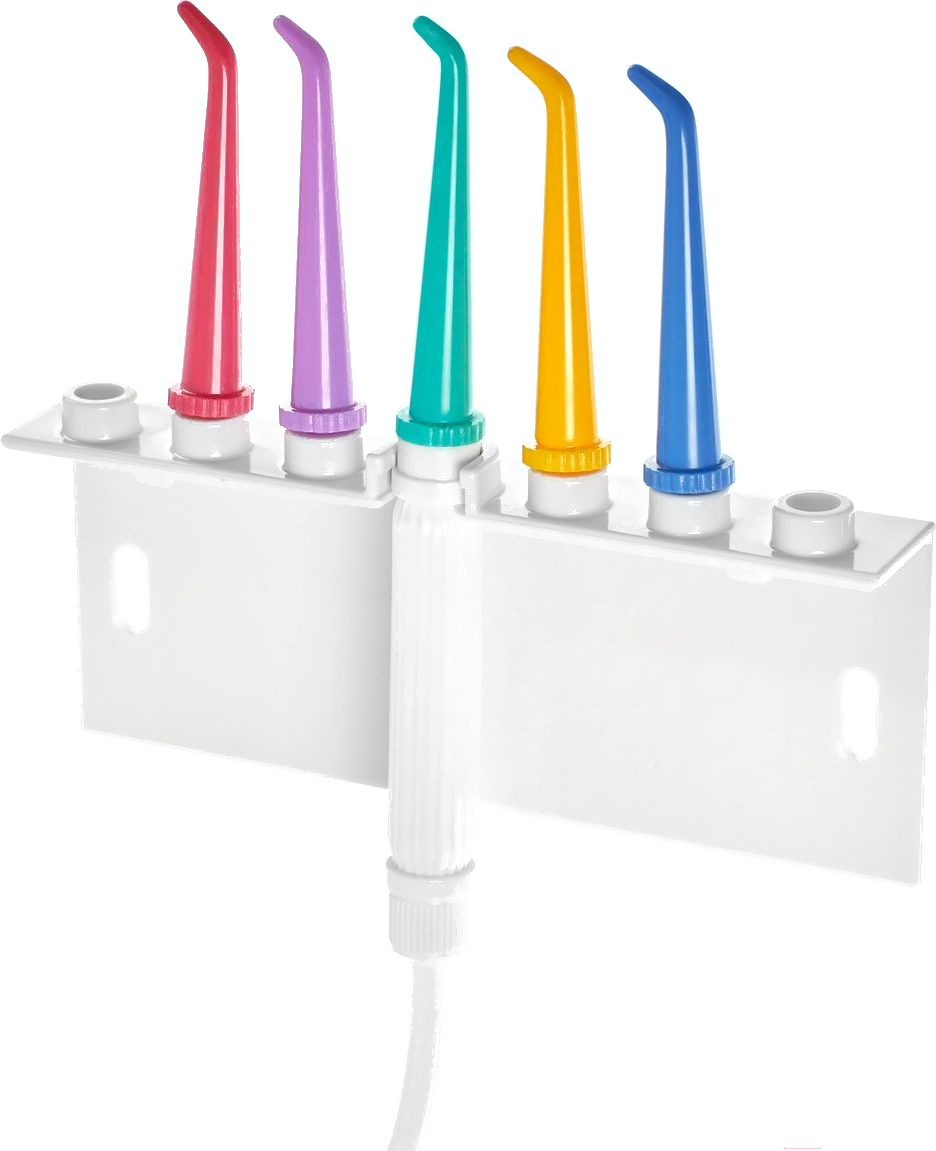В комплектеподставка (рама для крепления насадок на стену), индивидуальные насадки (5 шт), ручка, соединительная трубка (шланг из ПВХ), переходник (для крана), ключ (пластиковый шестигранный)