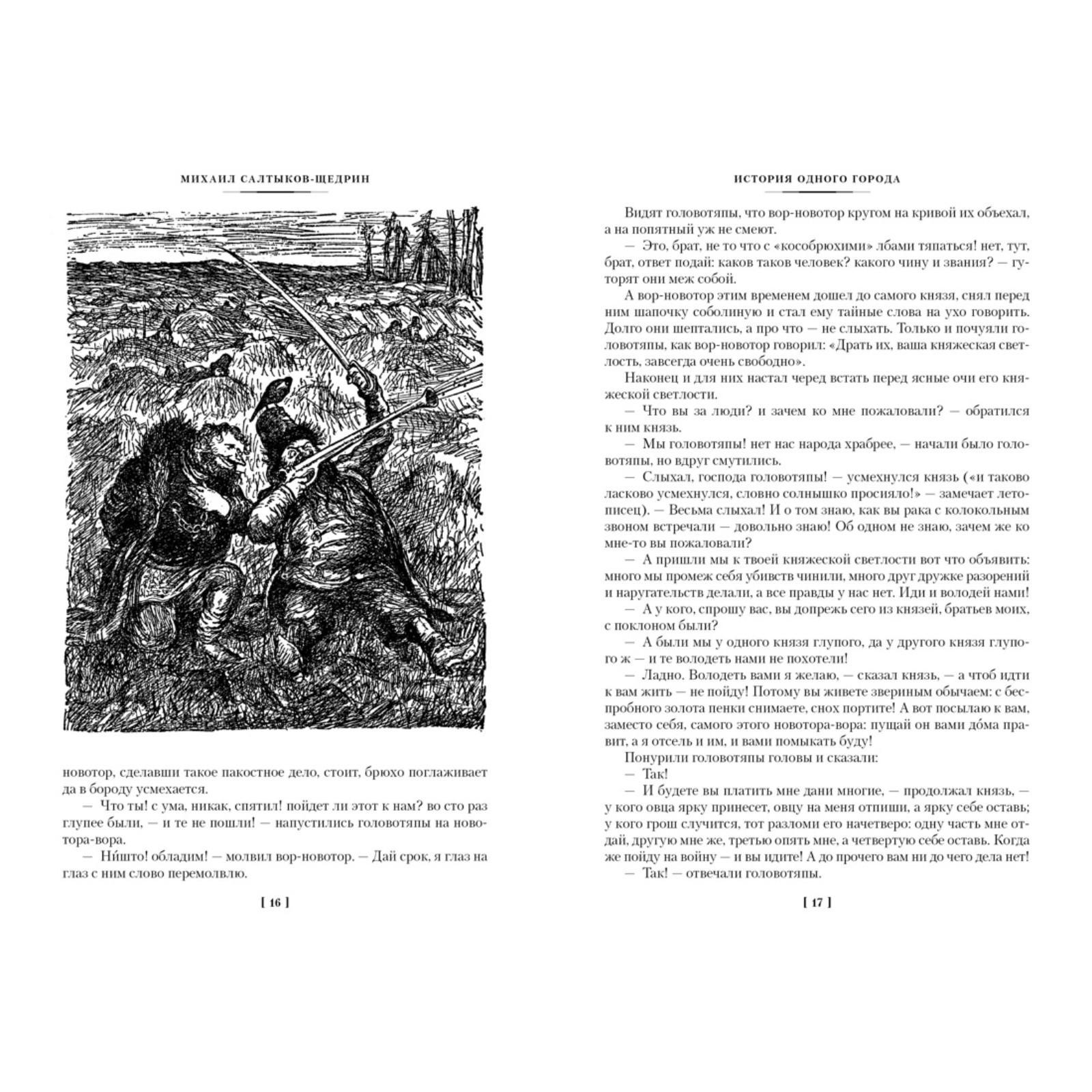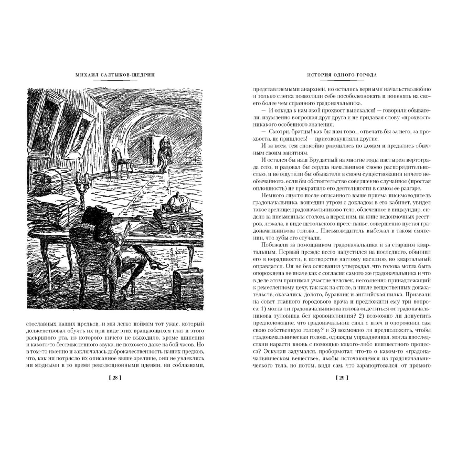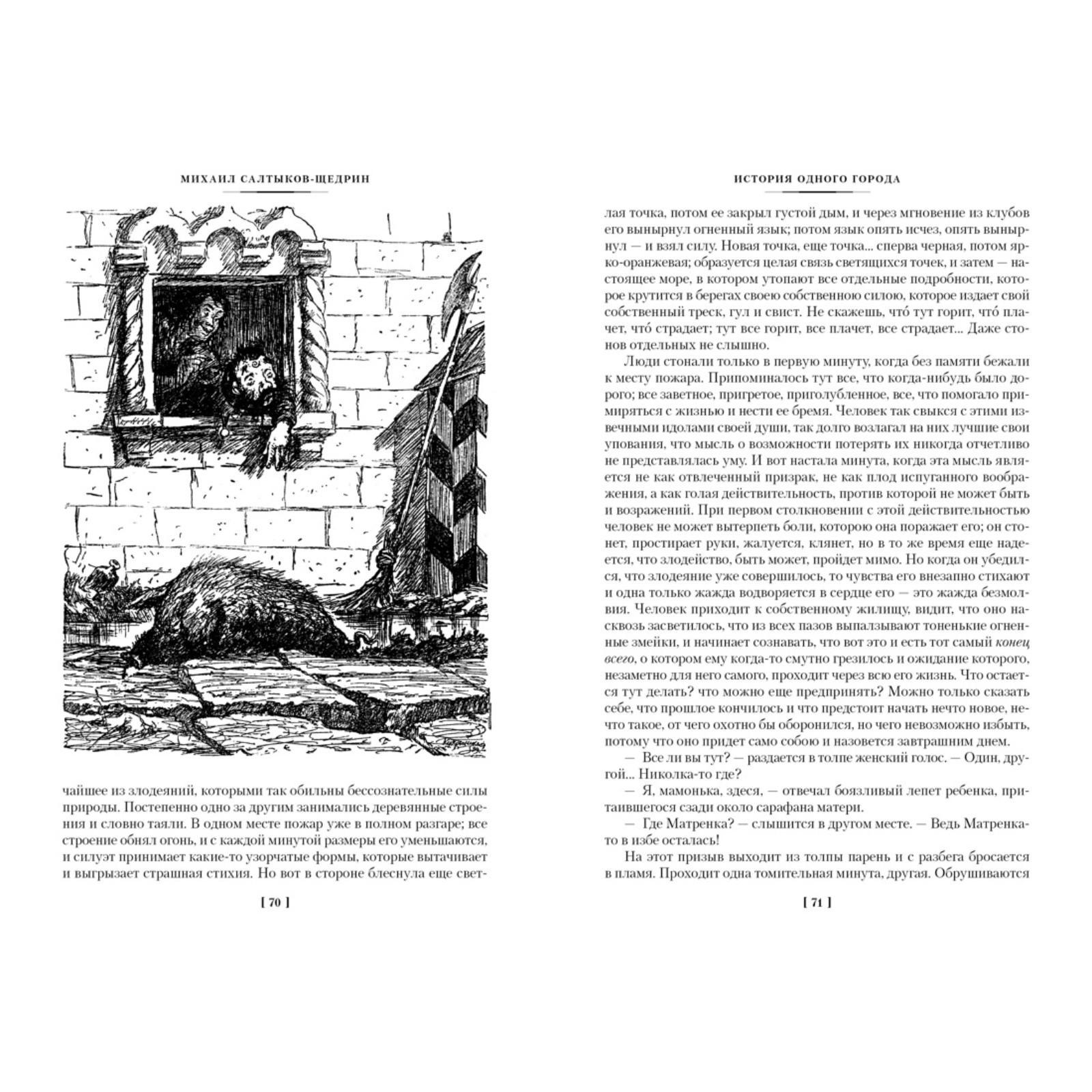 Творчество М. Е. Салтыкова-Щедрина занимает особое место в истории русской литературы. Его сатира откликалась на все значительные явления общественной жизни, безжалостно бичуя пороки, обличая ложь и нравственный упадок эпохи «великих реформ». Однако написанные на злобу дня, произведения Салтыкова-Щедрина парадоксальным образом не утрачивают своей актуальности. В настоящее издание вошли романы «История одного города» и «Господа Головлёвы», а также сказки. Тексты печатаются с иллюстрациями Михаила Куприянова, Порфирия Крылова и Николая Соколова — выдающихся русских художников, совместно работавших под творческим псевдонимом Кукрыниксы, а также Николая Кузьмина.
