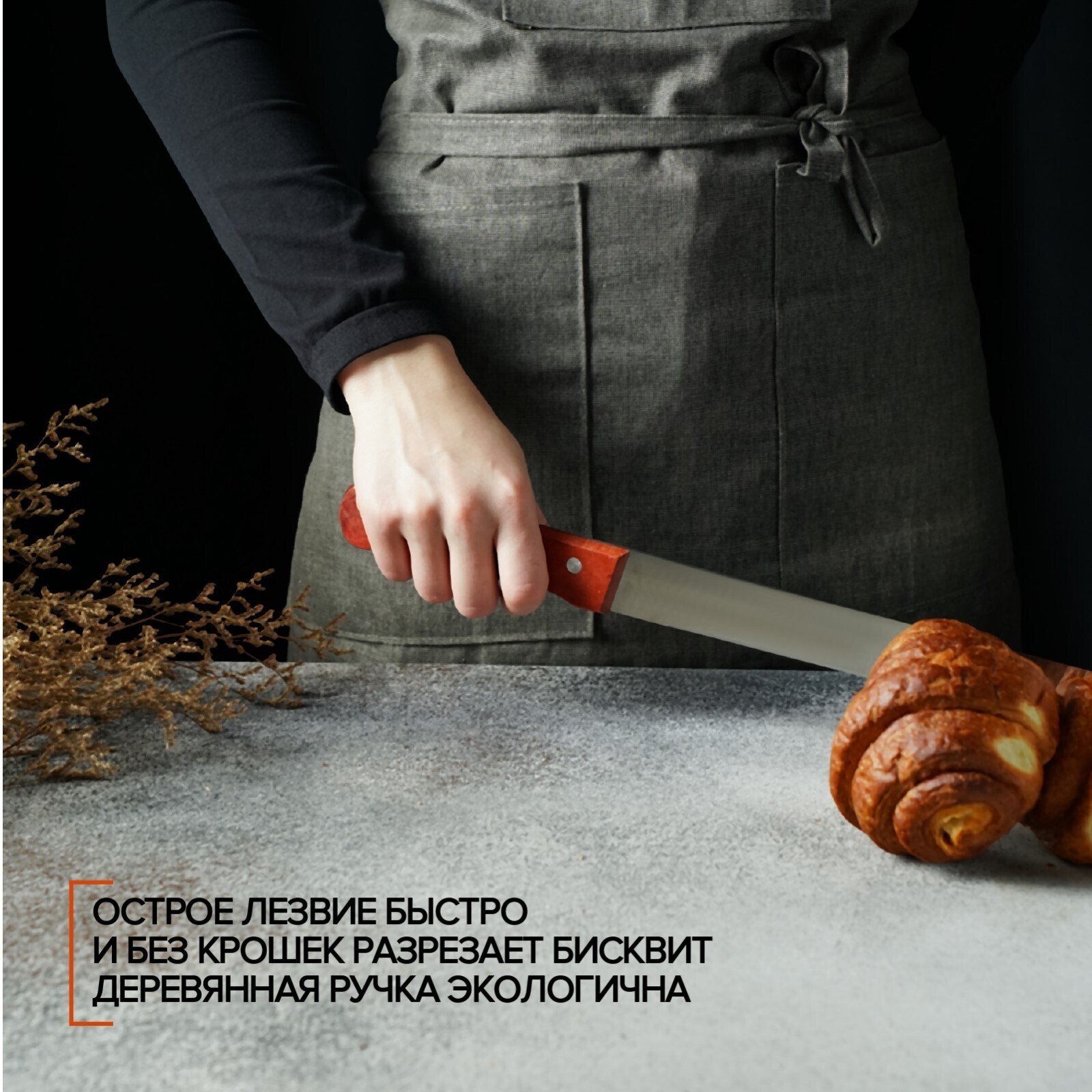 Нарезка бисквита — занятие куда более хлопотное, чем кажется. Его рыхлая структура делает применение стандартного кухонного ножа неоправданным: кулинарный шедевр, на приготовление которого было затрачено столько продуктов, сил и времени, будет крошиться и потеряет аппетитный вид.
