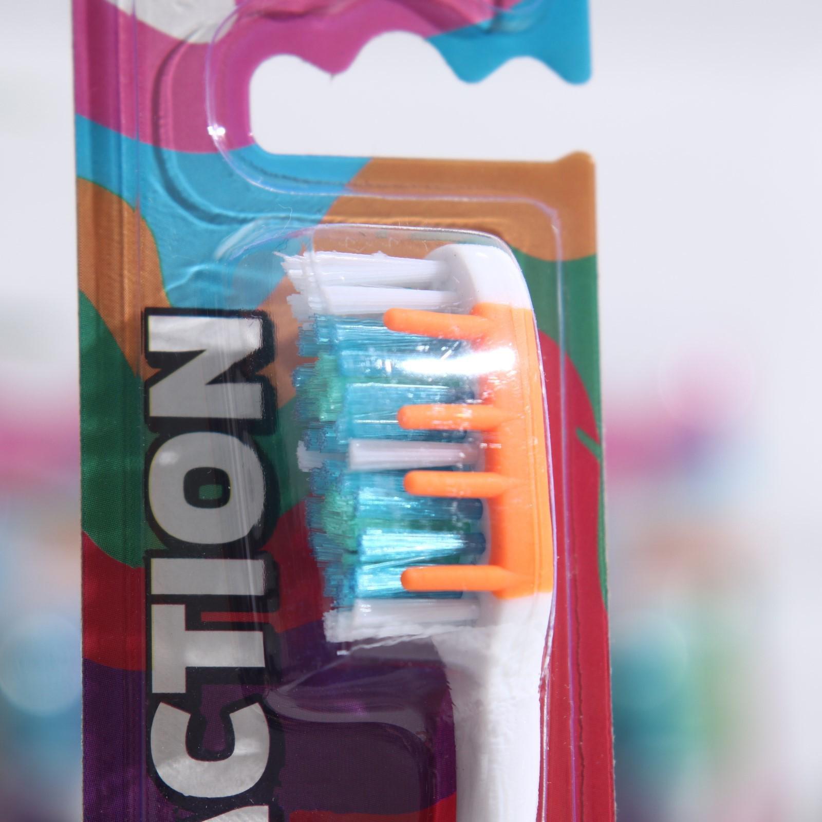 Зубная щётка средней жёсткости благодаря наличию силового выступа и дополнительных резиновых щетинок по внешнему краю рабочего поля интенсивно и тщательно очищает поверхность зубов от налёта. При этом закруглённые края щетинок не травмируют эмаль и десну. Безопасность, удобство и комфорт обеспечит ручка с защищающими от скольжения элементами. На обратной стороне щётки есть подушечка для удаления налёта с языка. Многоцветный яркий дизайн щётки привлекает внимание.