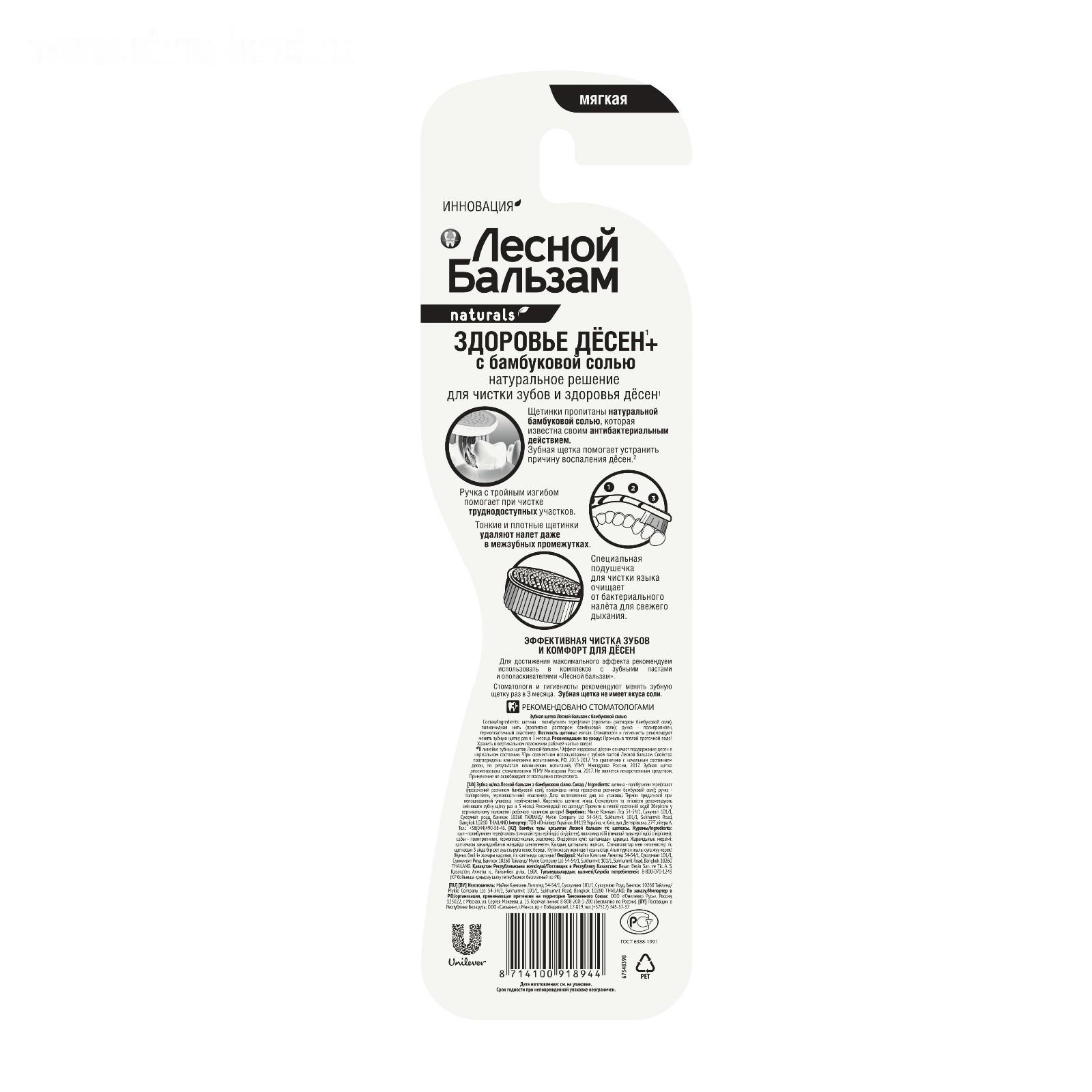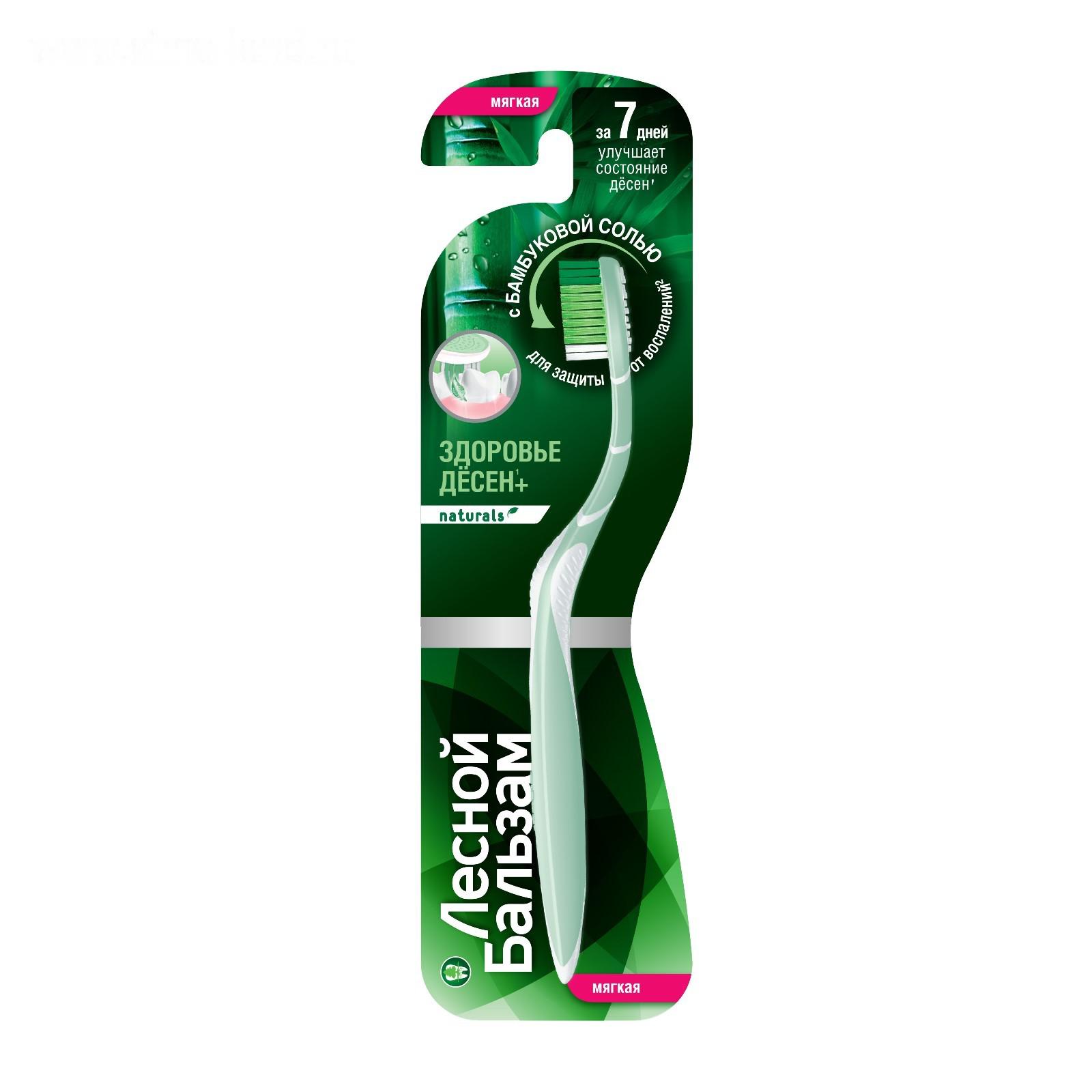 Мягкая зубная щетка Лесной бальзам с бамбуковой солью обеспечивает экстра-деликатный уход за зубами и деснами при воспалении и кровоточивости десен, подходит для ухода за чувствительными зубами и деснами.