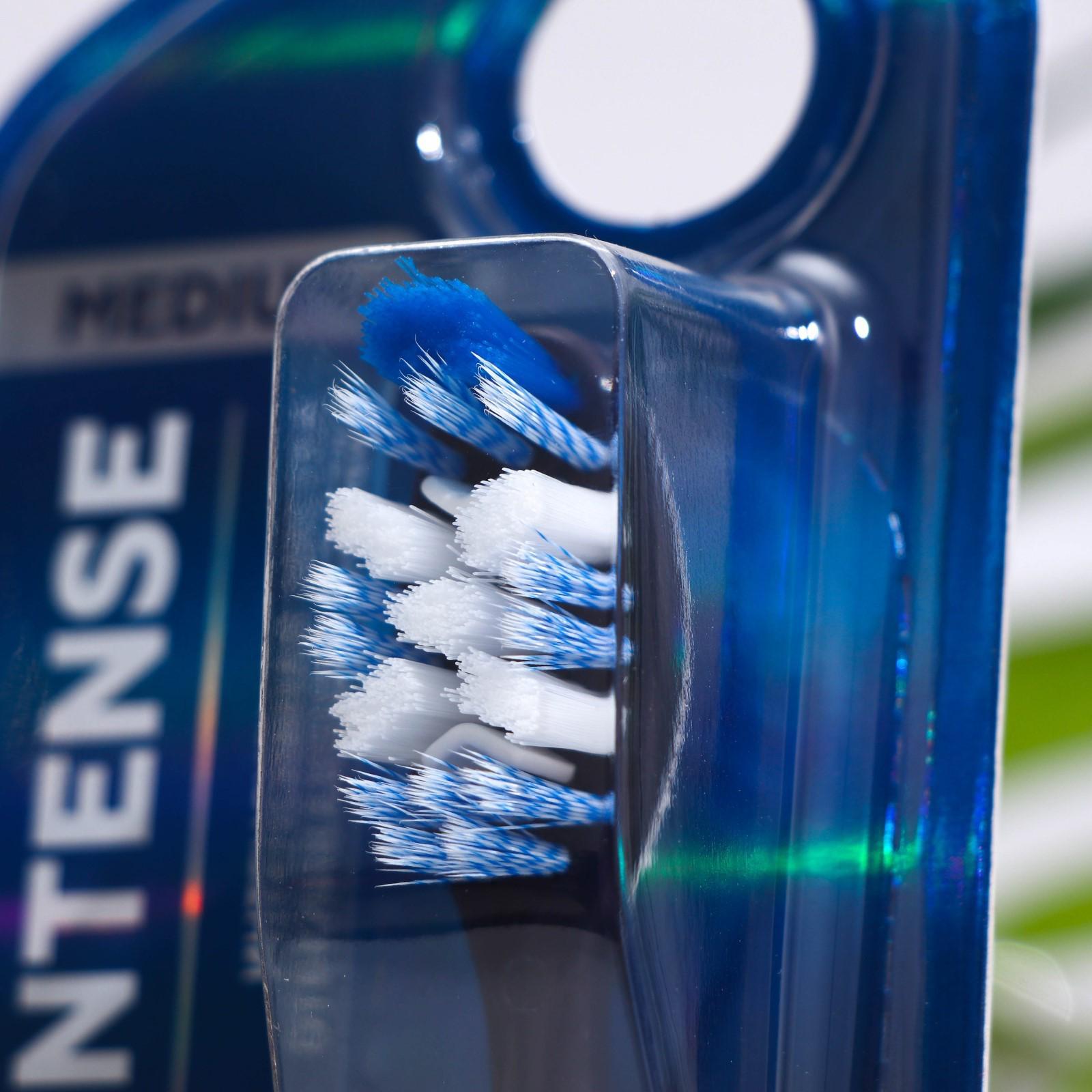 Описание: зубная щётка "EVERMEX INTENSE" с щетиной средней жёсткости для интенсивной чистки и отбеливания эмали. Щётка разработана для максимально эффективного очищения зубной эмали. Специально подобранная комбинация густых и тонких пучков удаляет налет в труднодоступных местах. Подушечка для чистки языка обеспечивает чистоту всей полости рта. Щетинки, собранные в густые и объемные пучки, образуют широкую поверхность, существенно увеличивающую очищающую способность щётки. Каждая щетинка имеет закругленный кончик, благодаря чему не повреждает эмаль и дёсны. Скрученные удлиненные щетинки с ультратонким кончиком хорошо очищают поверхность зубов. Силиконовые вставки полируют эмаль, придавая ей блеск и естественную белизну.