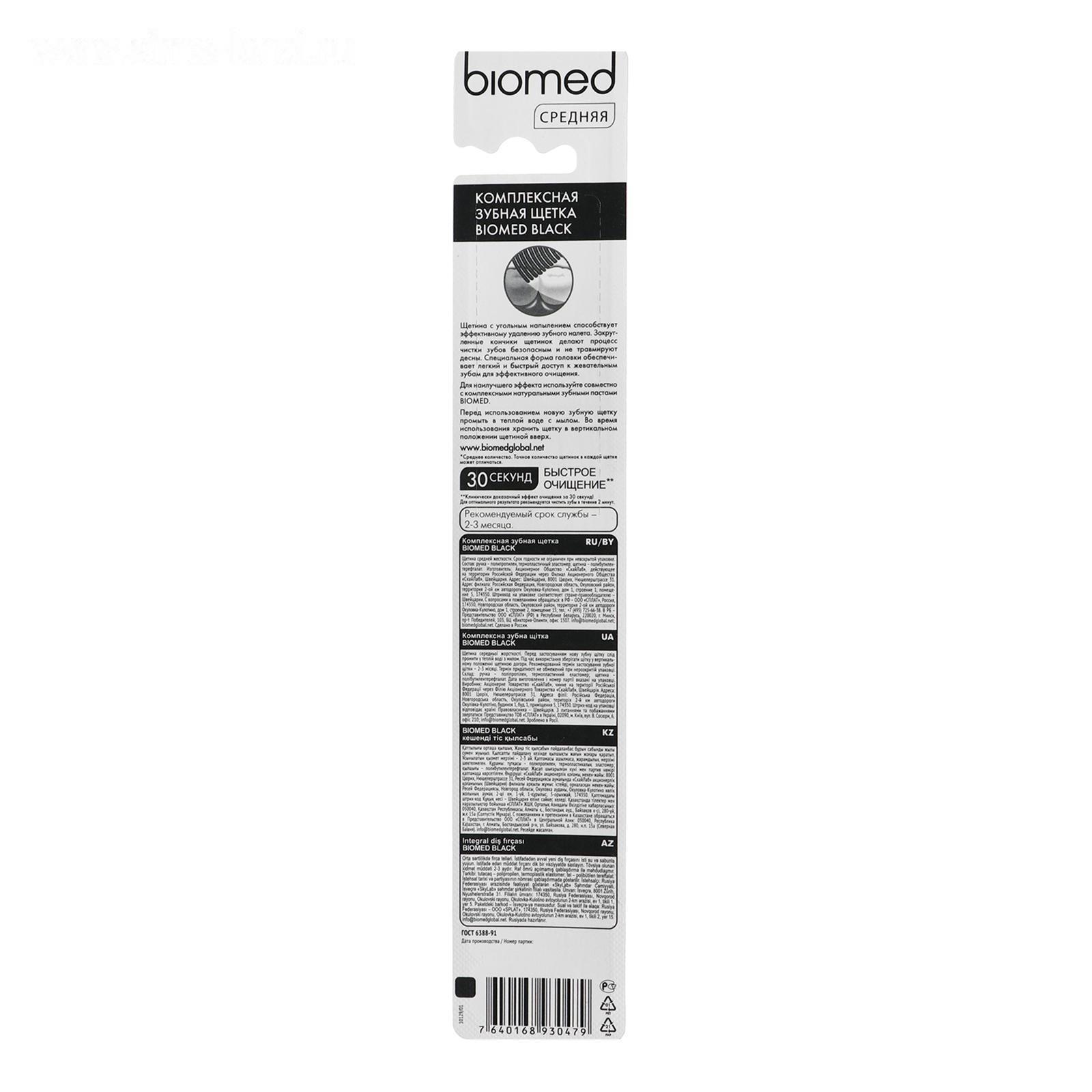 Описание: специальная форма головки обеспечивает легкий и быстрый доступ к жевательным зубам для эффективного очищения. Клинически доказанный эффект очищения за 30 секунд.Комплексная зубная щетка Biomed Черная. Щетина с древесным углем средней жесткости. 2024 щетинки.