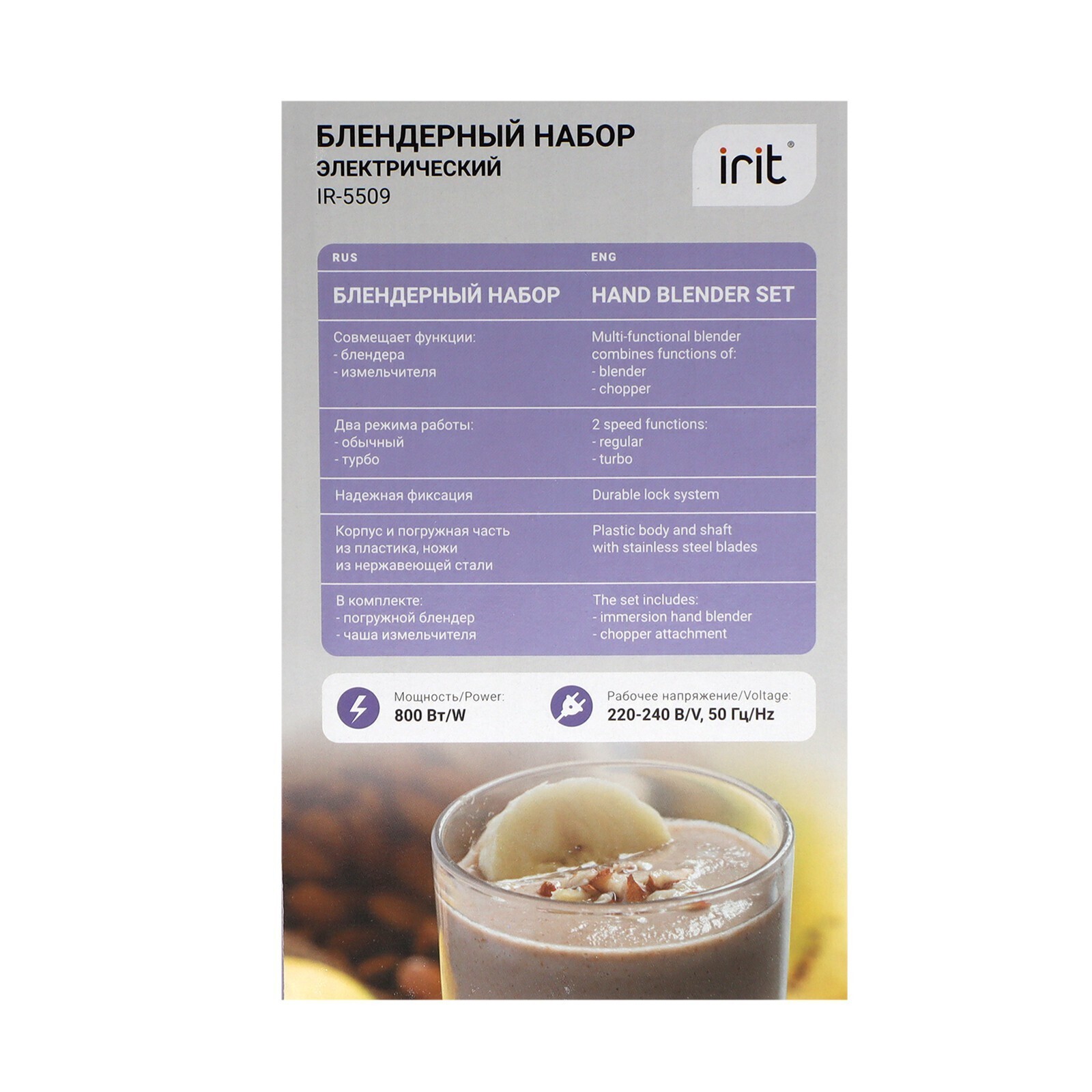 Блендер Irit IR-5509 предназначен для измельчения и смешивания продуктов, приготовления коктейлей и соусов. Имеет 2 скорости работы. Корпус и погружная часть выполнены из пластика, а ножи – из нержавеющей стали.
