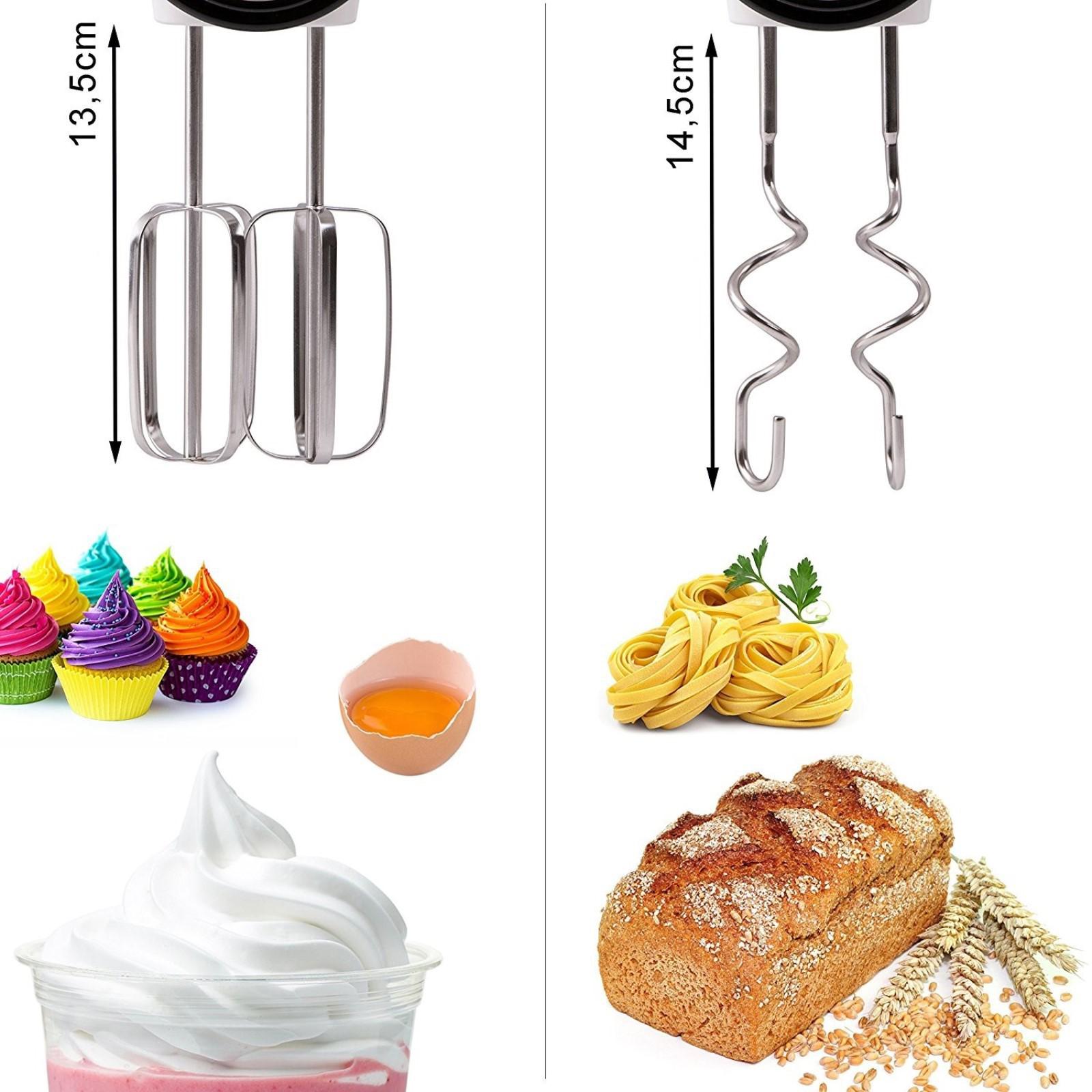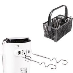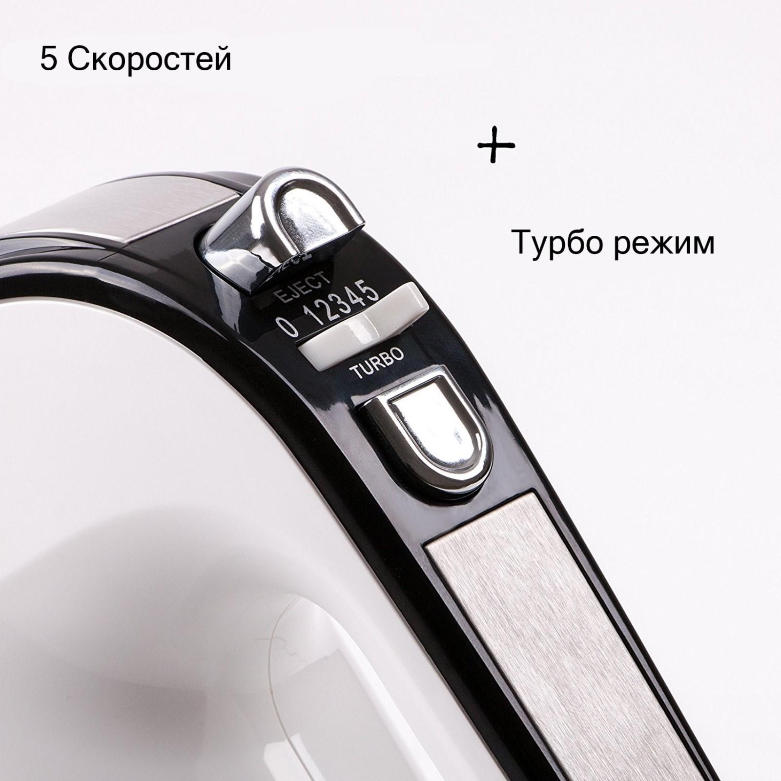 Устройство поставляется с двумя типами насадок: венчиками, которые оптимальны для взбивания жидких по консистенции продуктов, и крюков, предназначенных для приготовления густого теста.