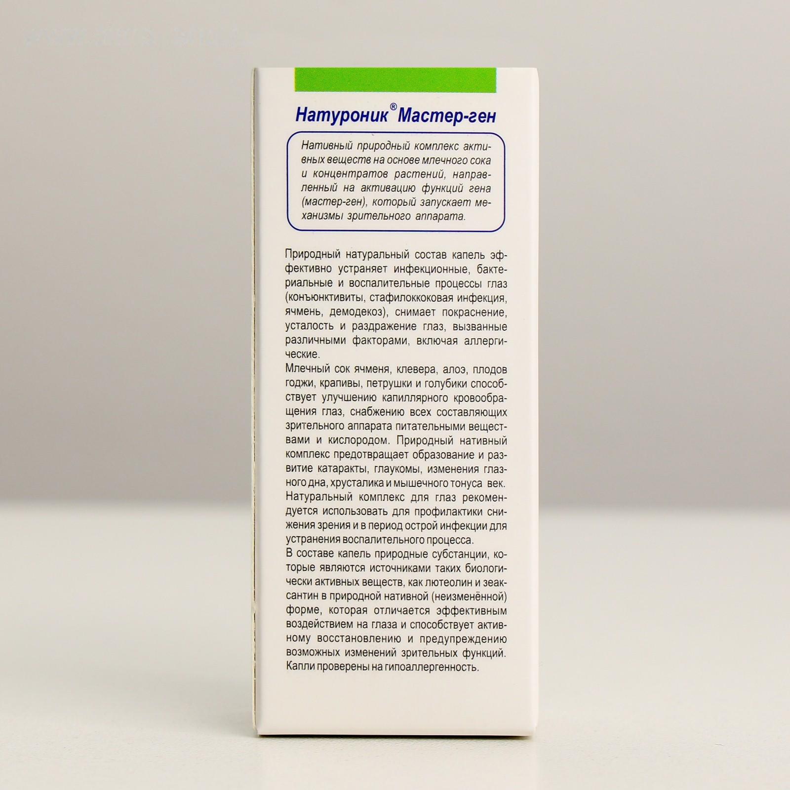 Натуроник® Мастер-ген, органелло-капли для глаз содержат природный комплекс млечного сока и концентратов растений, направленны на активацию функций гена (мастер-ген), который запускает механизмы зрительного аппарата и предупреждает изменения зрительного аппарата глаза. В составе капель содержится природный антиоксидант карнозин, который защищает глаза от разрушения светом, а также таурин, предупреждающий катаракту и глаукому. Природный натуральный состав капель эффективно устраняет инфекционные, бактериальные и воспалительные процессы глаз (конъюнктивит, стафилококковая инфекция, ячмень, демодекоз), снимает покраснение, слезоточивость, усталость и раздражение глаз, вызванные различными факторами, включая аллергические.