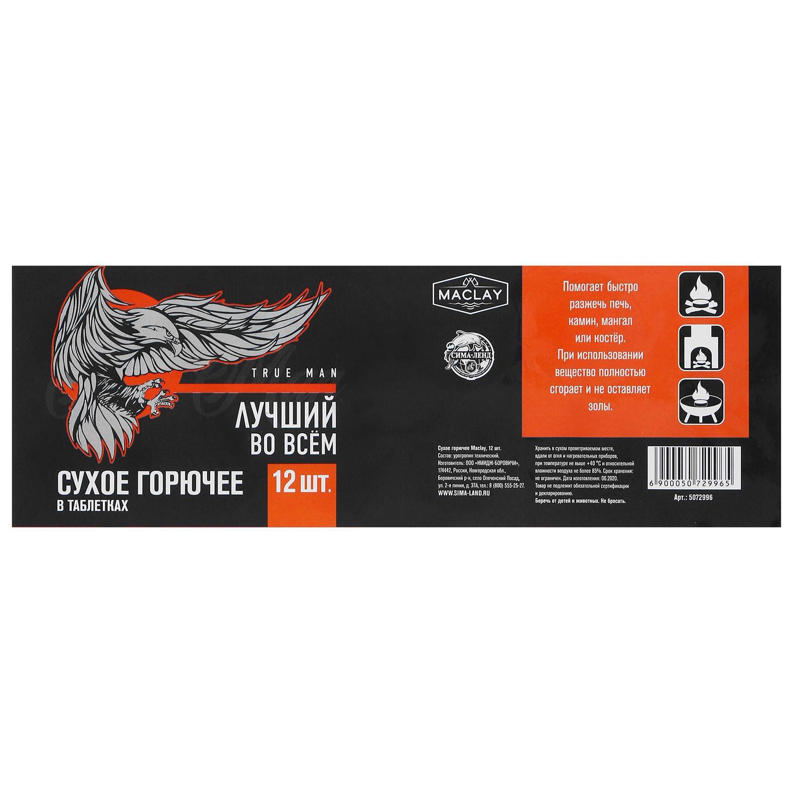Сухое горючее — приспособление для тех, кому необходимо быстро разжечь печь, камин, мангал или костёр. При использовании вещество полностью сгорает и не оставляет золы. Такие таблетки не рекомендованы для непосредственного приготовления пищи, они подходят для разогрева углей или дров. Пламя от сухого горючего чувствительно к ветру, поэтому может понадобиться защитный экран.