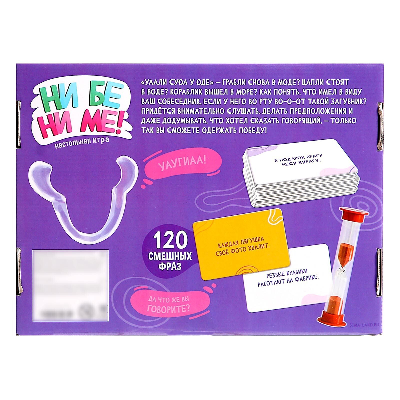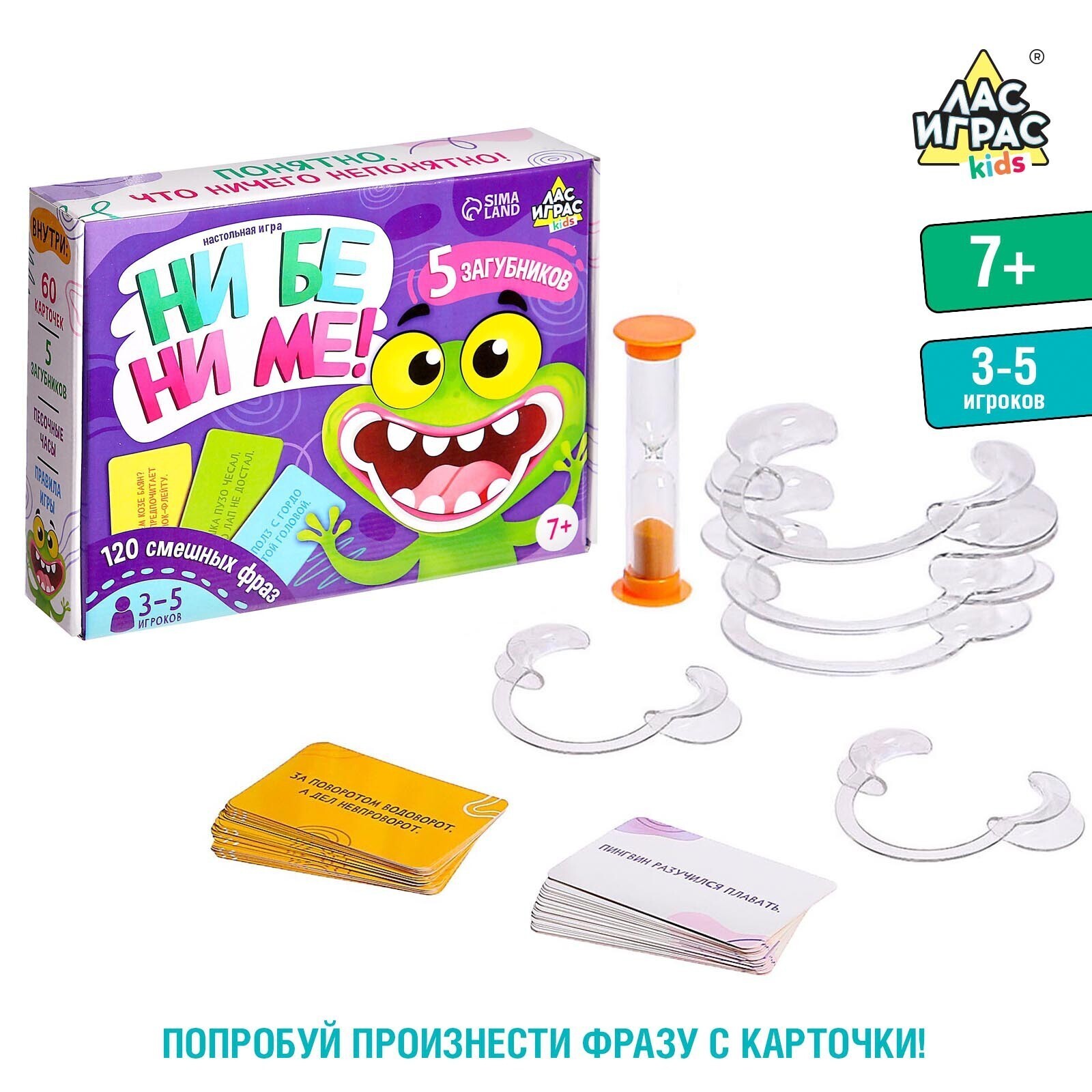 Докажите друзьям, что вы самый внимательный слушатель! В настольной игре «Ни бе ни ме!» ваш соперник с загубником во рту будет проговаривать слова со своей карточки, а вам нужно слушать и высказывать предположения, чтобы догадаться, что же он хотел сказать. Проявите всю свою внимательность, чтобы победить!