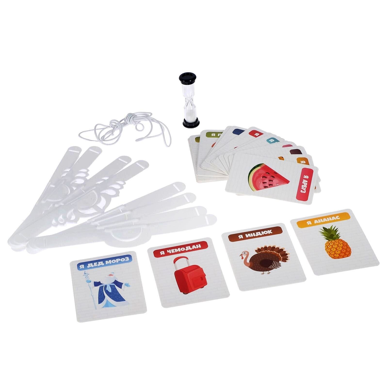Правила игры: 1. Перемешайте карточки и выложите на стол рисунками вниз. Вытяните случайную карту и поместите на диадемку-держатель. 2. Переверните песочные часы и начните задавать вопросы, на которые можно ответить «да» или «нет». 3. Если справились за минуту – возьмите новую карточку. Ход переходит к следующему участнику. 4. Игра идет, пока не закончатся все карточки. Победителем признается участник, собравший больше всех карточек.