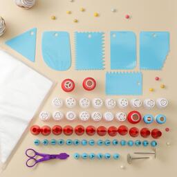 В наборе есть всё для приготовления чудесных десертов: скребки и шпатели для выравнивания крема на тортах, кондитерские мешки и насадки для создания уникального декора.