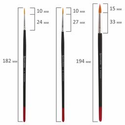 Кисти из синтетических волокон отлично впитывают и отдают краску, хорошо держат форму, долговечны и надежны. Кисти №1, 2 подходят для проработки мелких деталей. Кисти №5 и №8 позволят прорисовывать более крупные детали и наносить широкие мазки и линии. Деревянную крашеную рукоятку кисти удобно держать в руке.