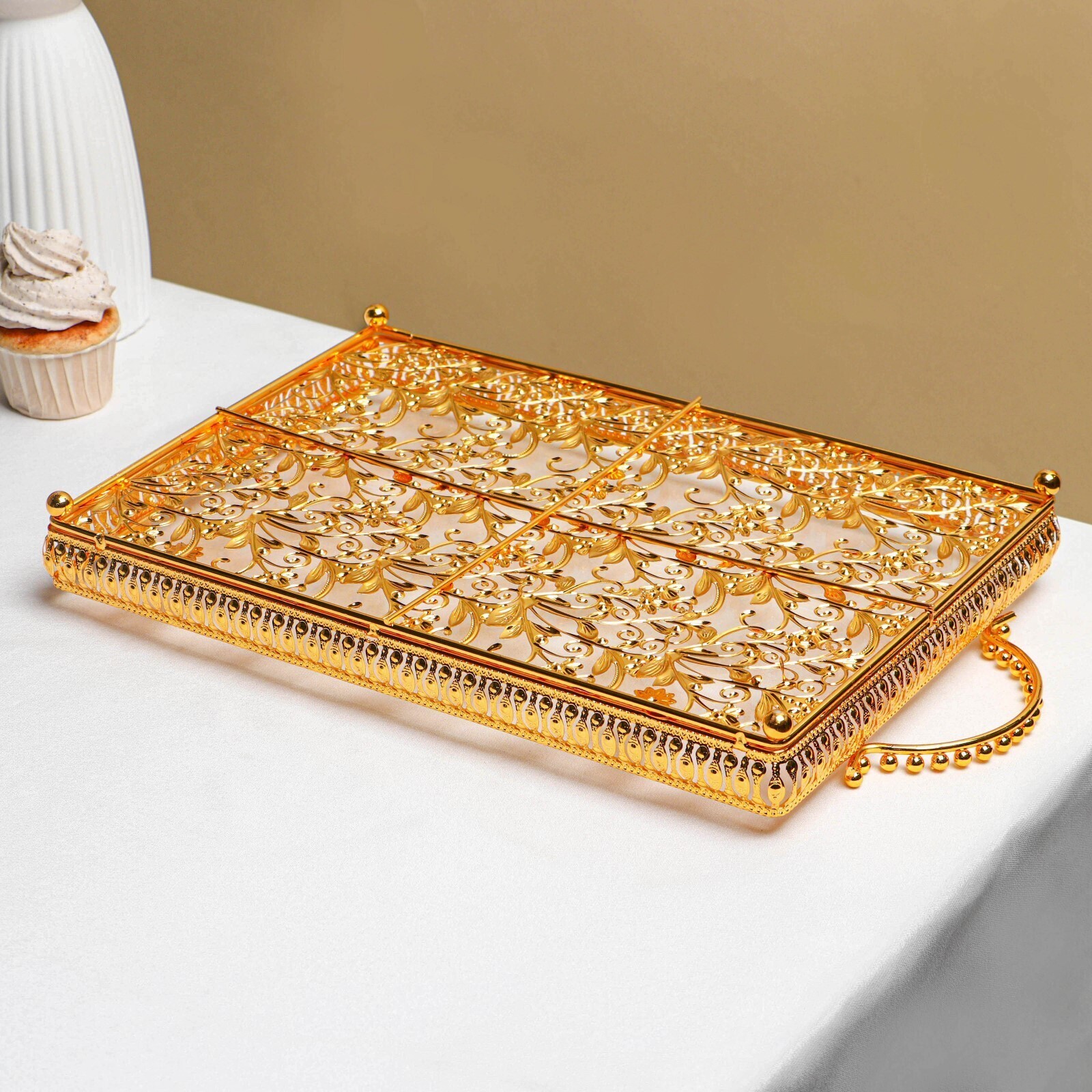 Подставка для десертов позволит эффектно подать сладости и закуски к праздничному столу. Подставка выполнена из стекла и металла «под золото».