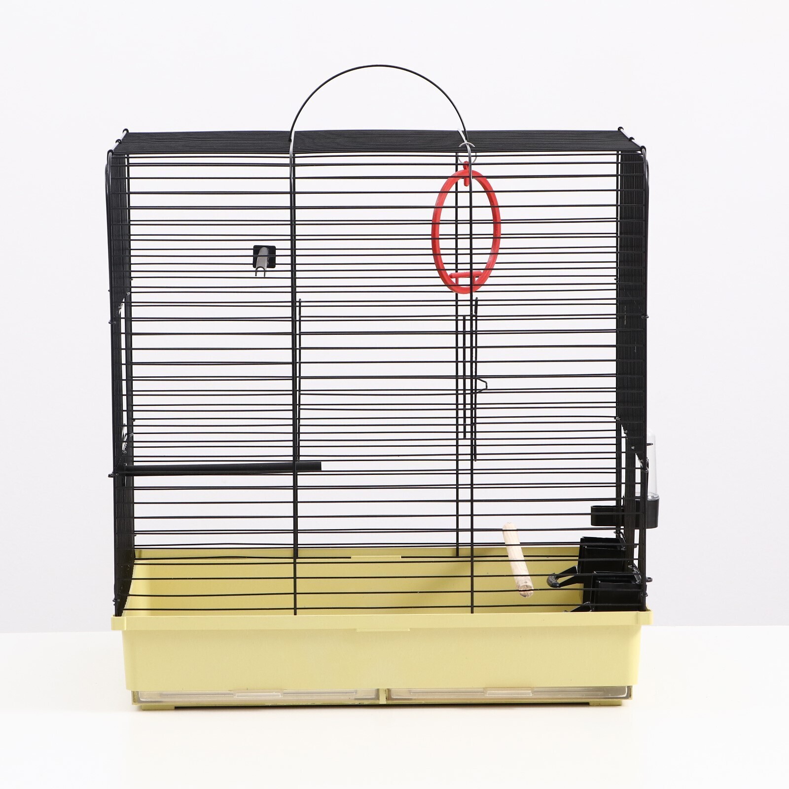 Кроме того, клетка оборудована удобной ручкой на крыше, облегчающей процесс переноски изделия, и специальным пластиковым выдвижным поддоном, облегчающим процесс уборки.