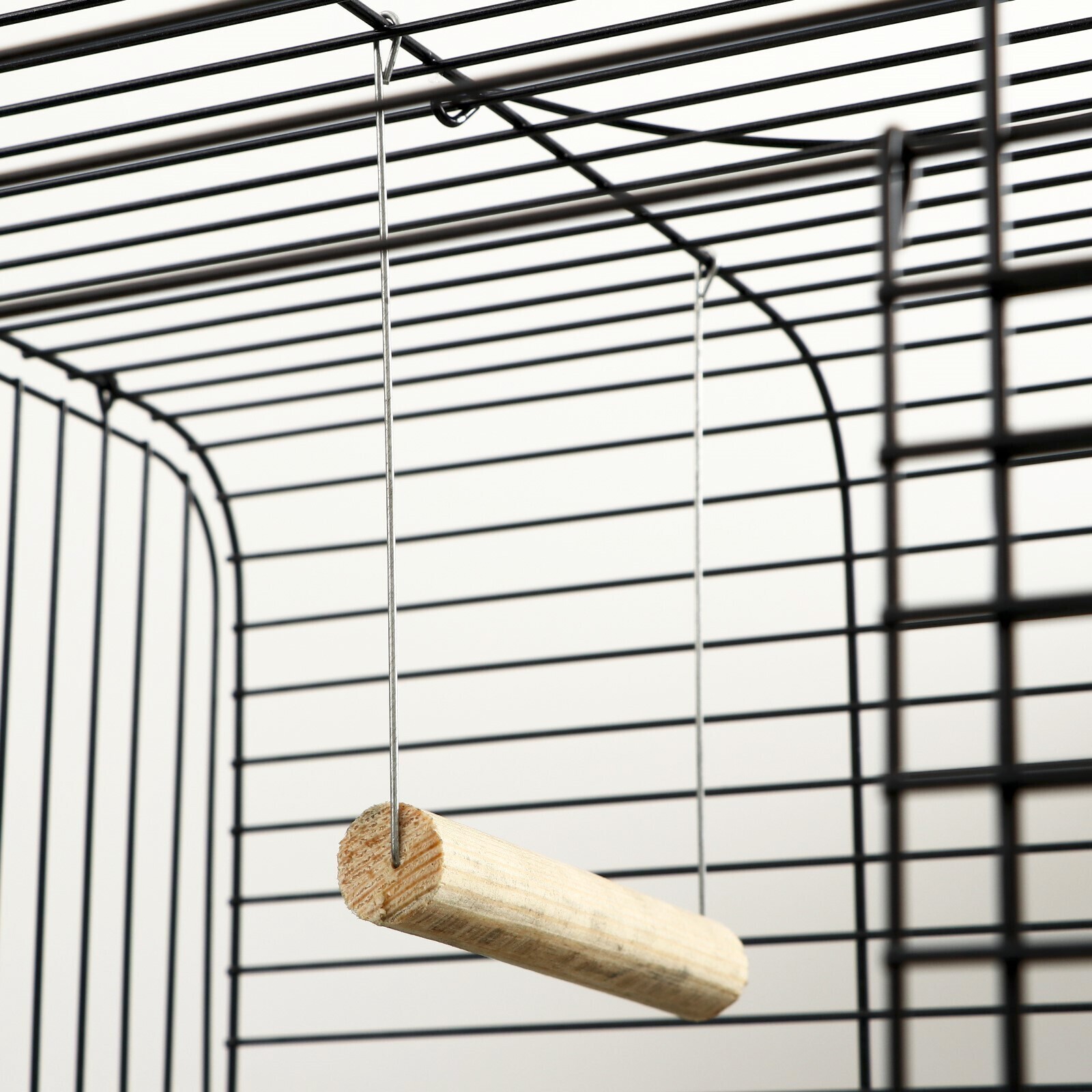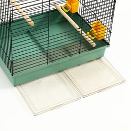 Кроме того, клетка оборудована удобной ручкой на крыше, облегчающей процесс переноски изделия, и специальным пластиковым выдвижным поддоном, облегчающим процесс уборки.