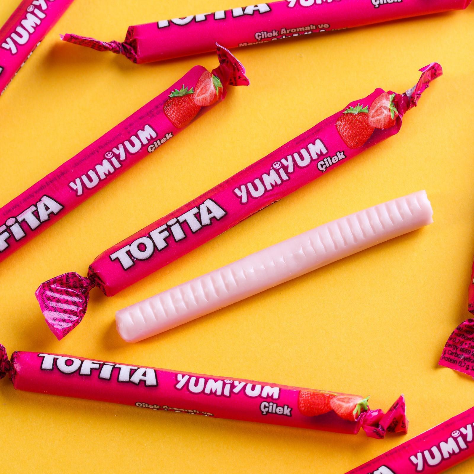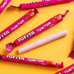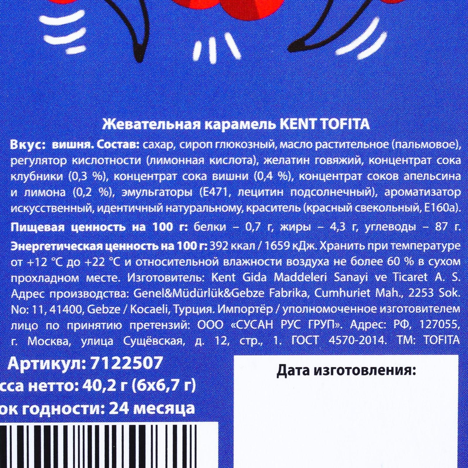 Состав: сахар, сироп глюкозный, масло растительное (пальмовое), регулятор кислотности (лимонная кислота), желатин говяжий, концентрат сока клубники (0,3 %), концентрат сока вишни (0,4 %), концентрат соков апельсина и лимона (0,2 %), эмульгаторы (Е471, лецитин подсолнечный), ароматизатор искусственный, идентичный натуральному, краситель (красный свекольный, Е160а).