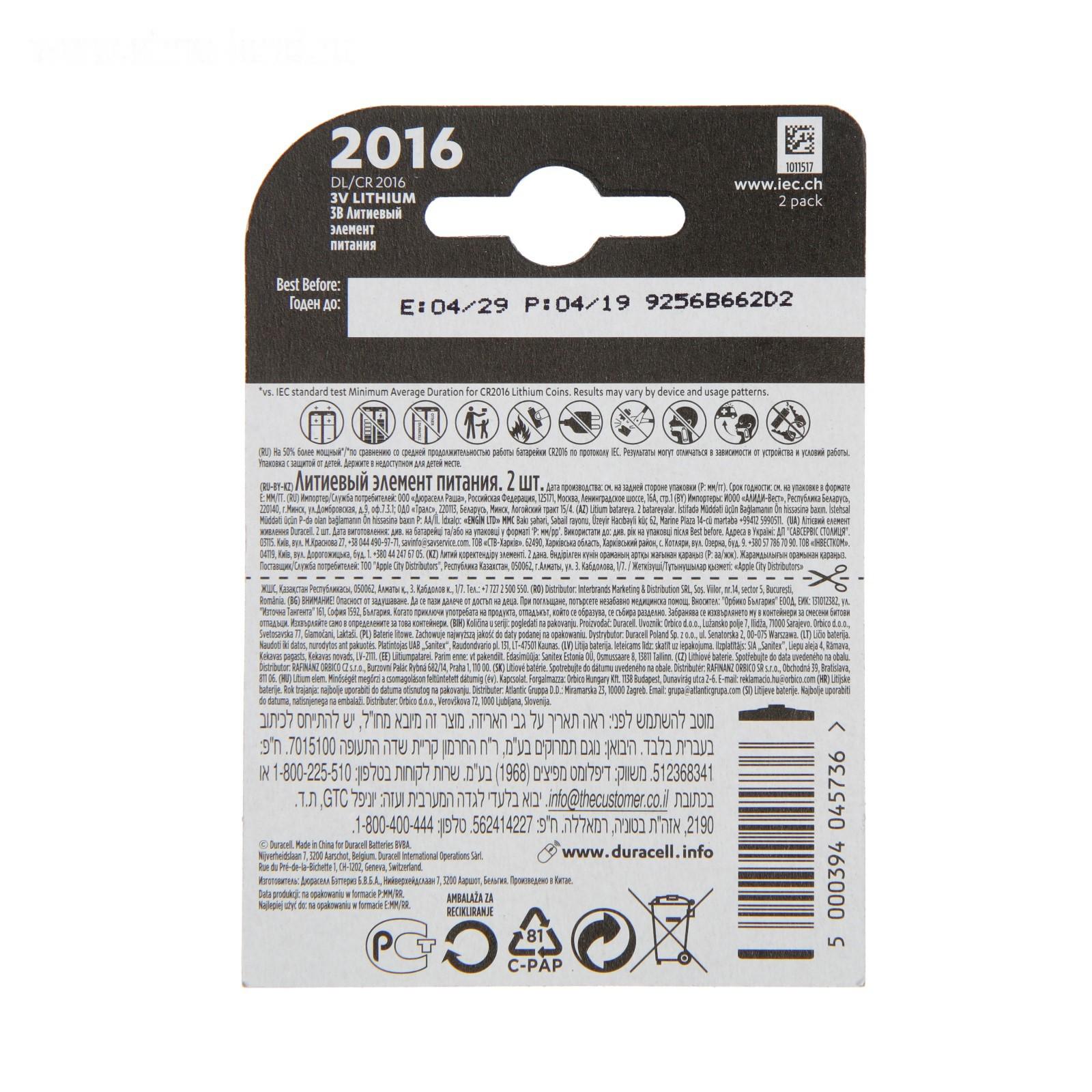 Батарейка литиевая Duracell, CR2016-2BL, 3В, блистер, 2 шт.