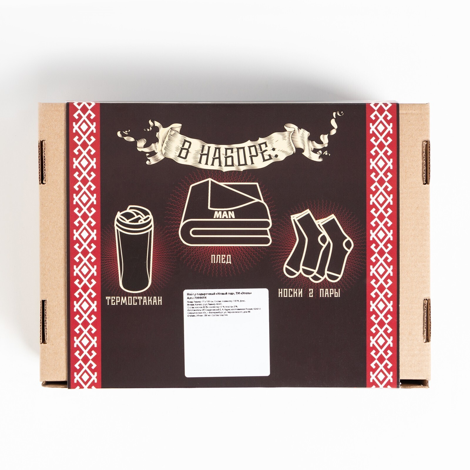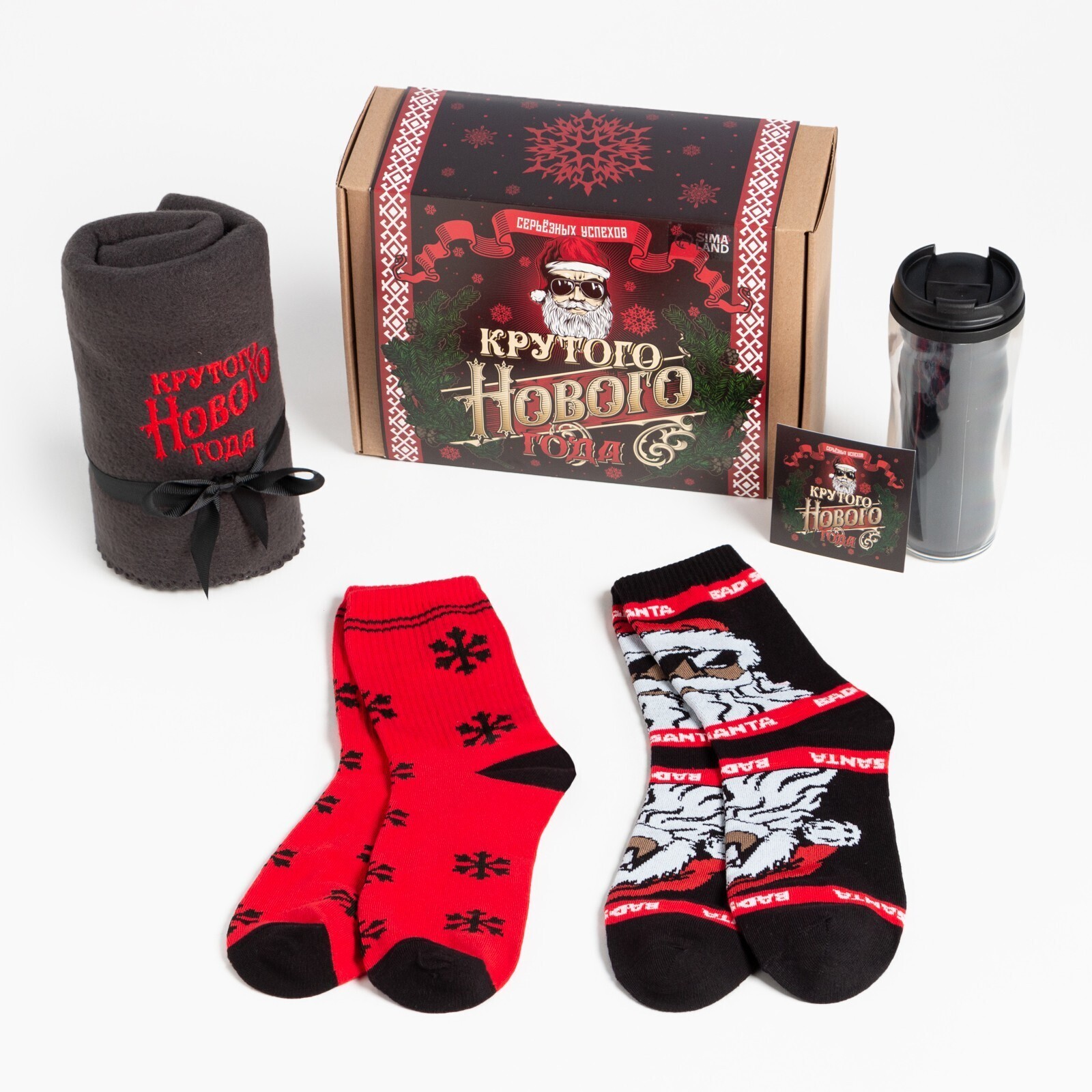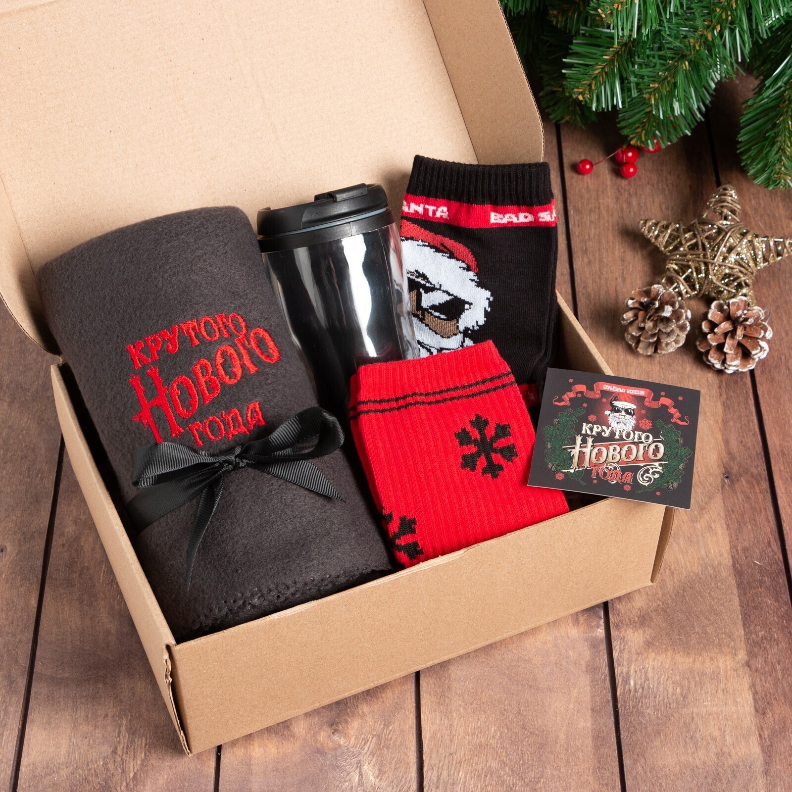 • Составляющие набора Носки, Открытка, Плед, Термостакан
