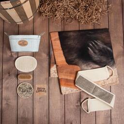 • Составляющие набора Мочалка, Мочалка-спонж, Открытка, Подставка под горячее, Полотенце, Щёточка