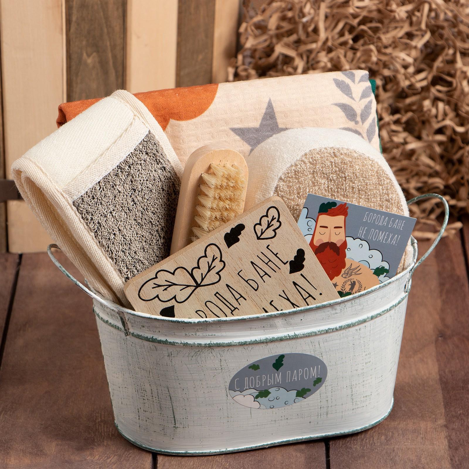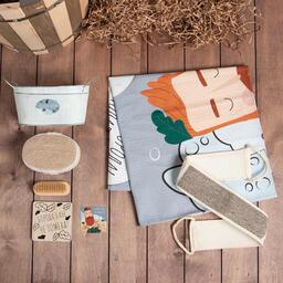• Составляющие набора Мочалка, Мочалка-спонж, Открытка, Подставка под горячее, Полотенце, Щёточка