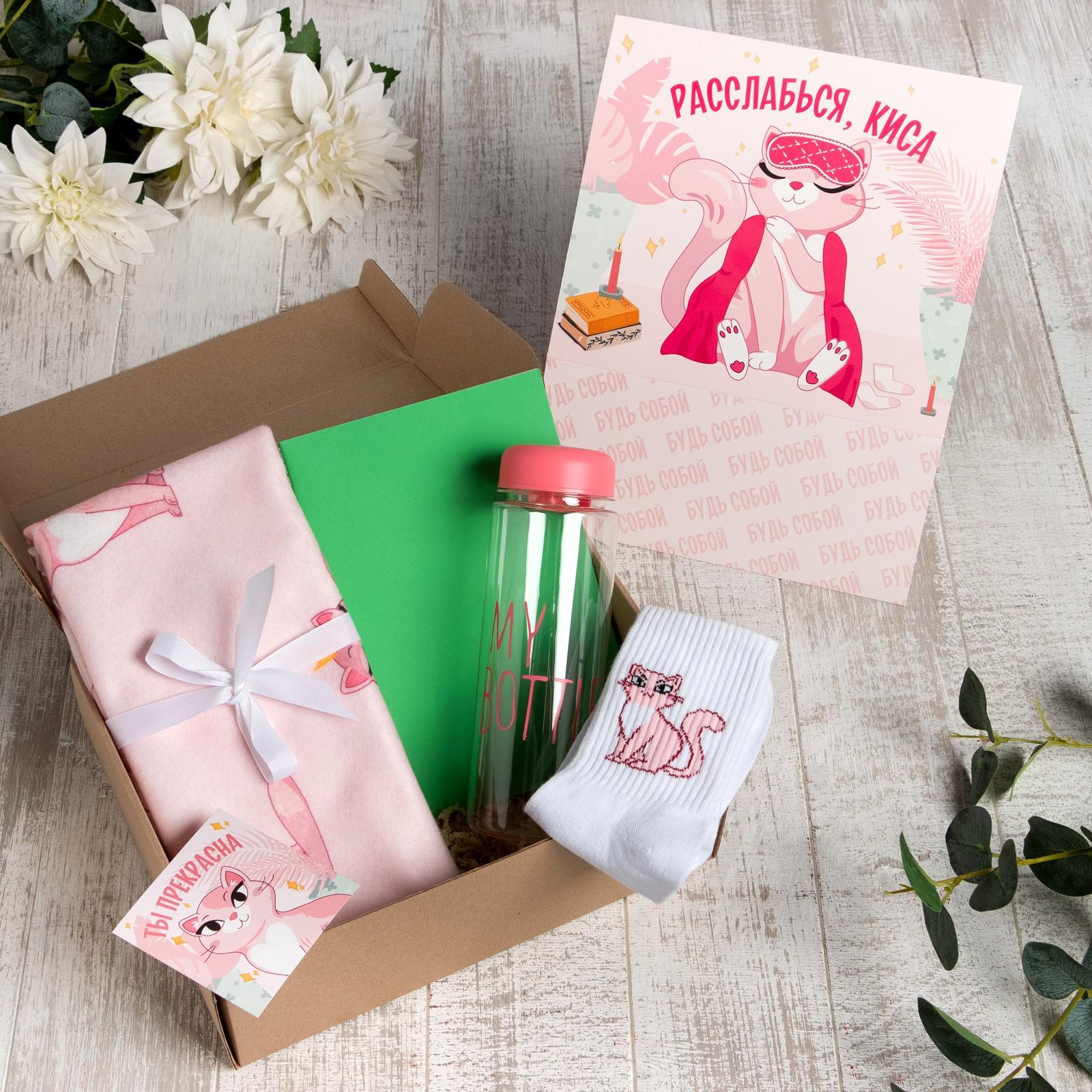 • Составляющие набора Блокнот, Бутылка, Носки, Открытка, Плед